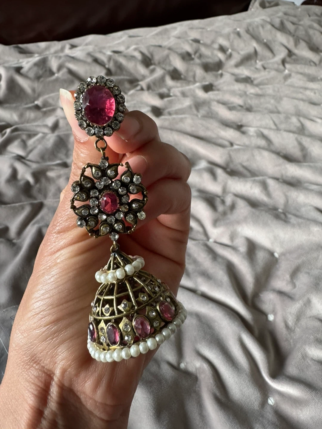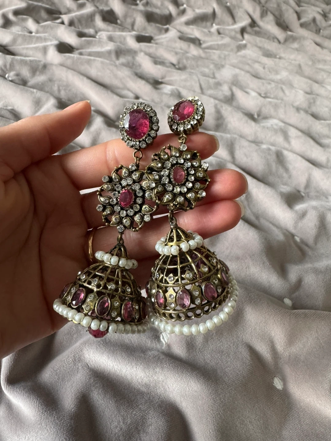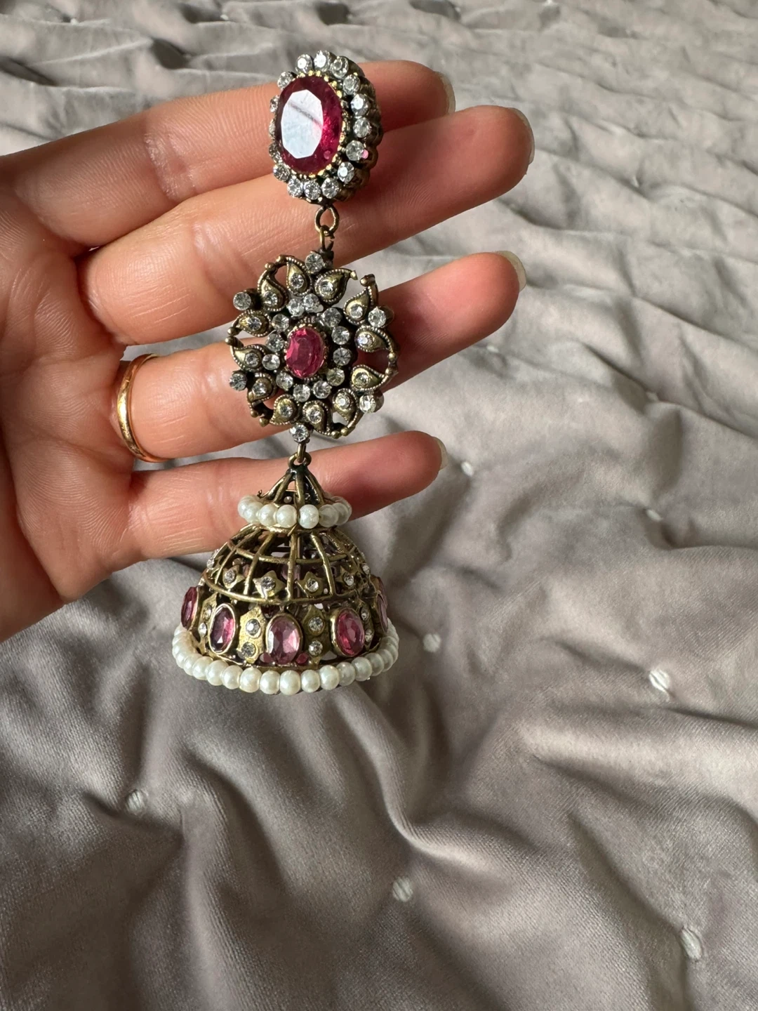These beautiful jhumka earrings feature intricate detailing with red and clear stones, accented with small pearls. The design includes a bell-shaped base, perfect for adding a touch of elegance to any traditional or festive outfit. They're made with metal and adorned with faux gems and pearls.