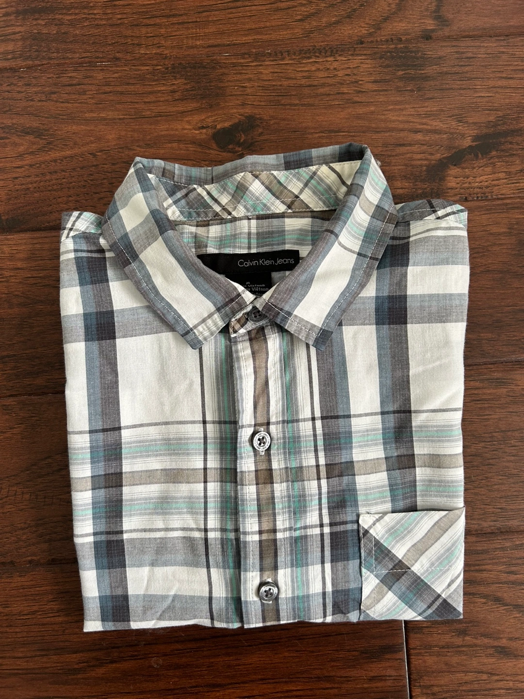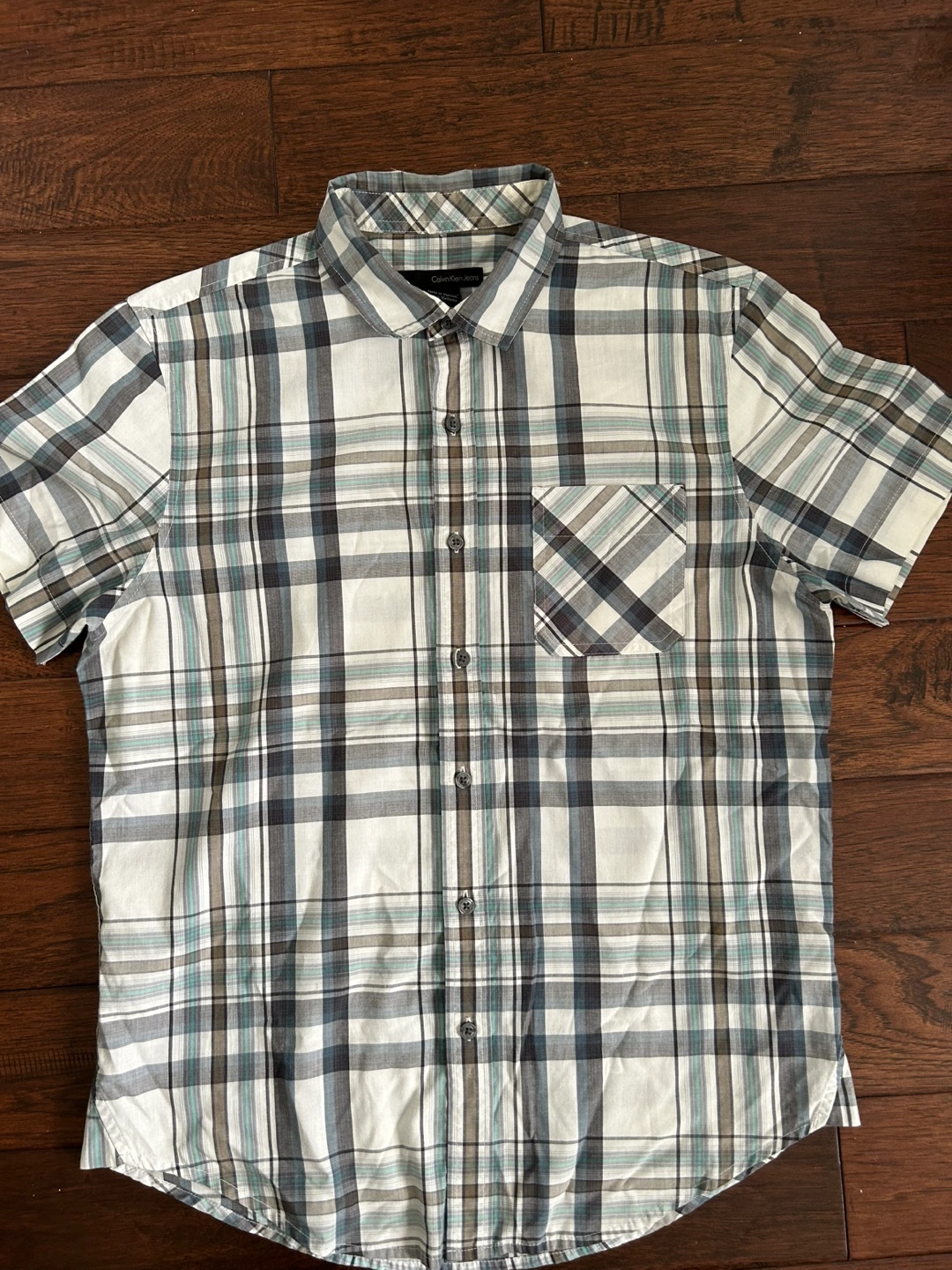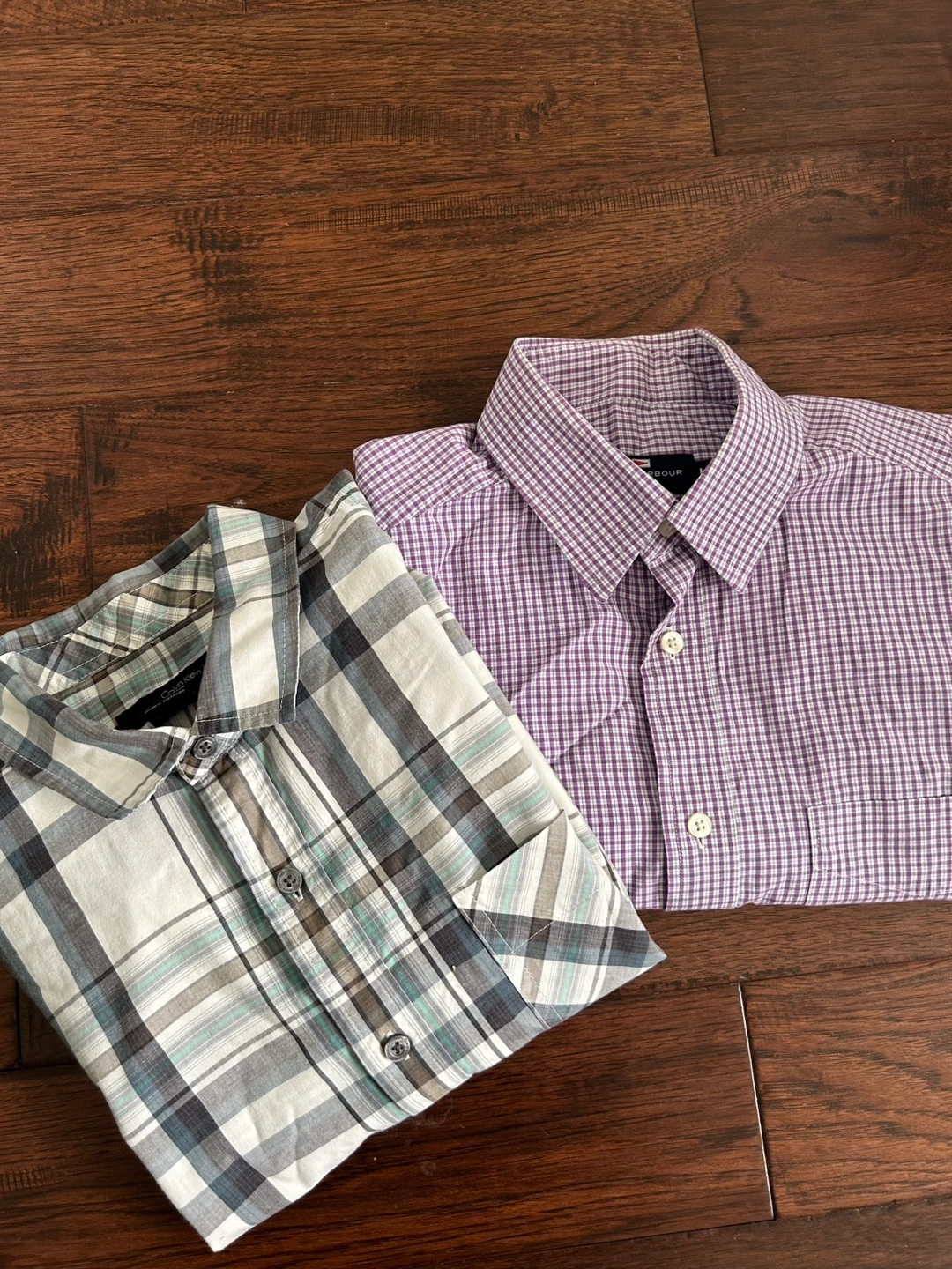 Bundle of two men's short sleeve button-down shirts from Calvin Klein Jeans and Mark & Spencer. One shirt features a purple and white plaid pattern, the other a blue, grey and white plaid pattern. Both are in good condition! Size medium.
