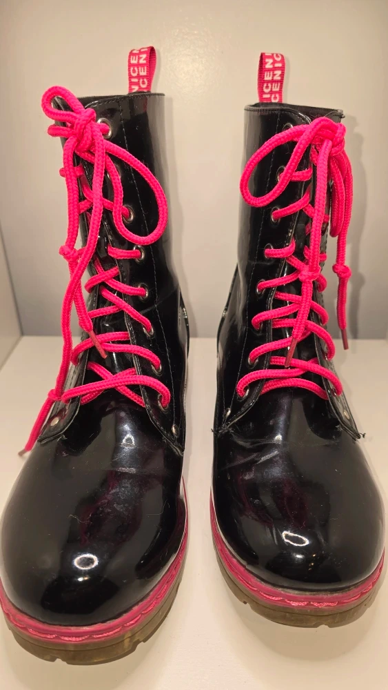 Selling a pair of Carrini black patent boots! They feature a cool HOT pink trim and laces. The soles show some wear, but they're still in good condition for stomping around town