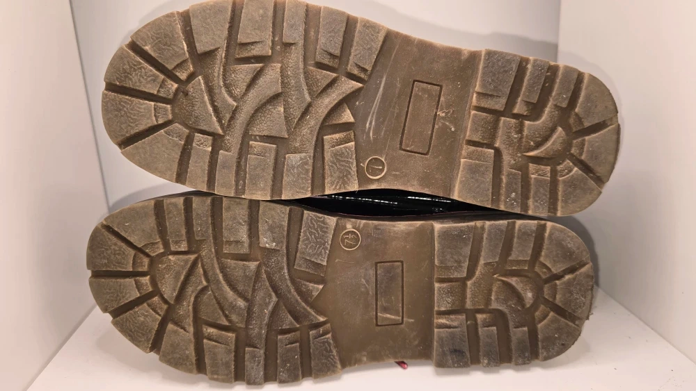 Never noticed until now the right food is seven and a half and the left is size 7 LOL obviously not much of a difference if I didn't notice ๐๐๐ these a couple times they are black patent all man-made excellent winter boots if you need room for thick fluffy socks