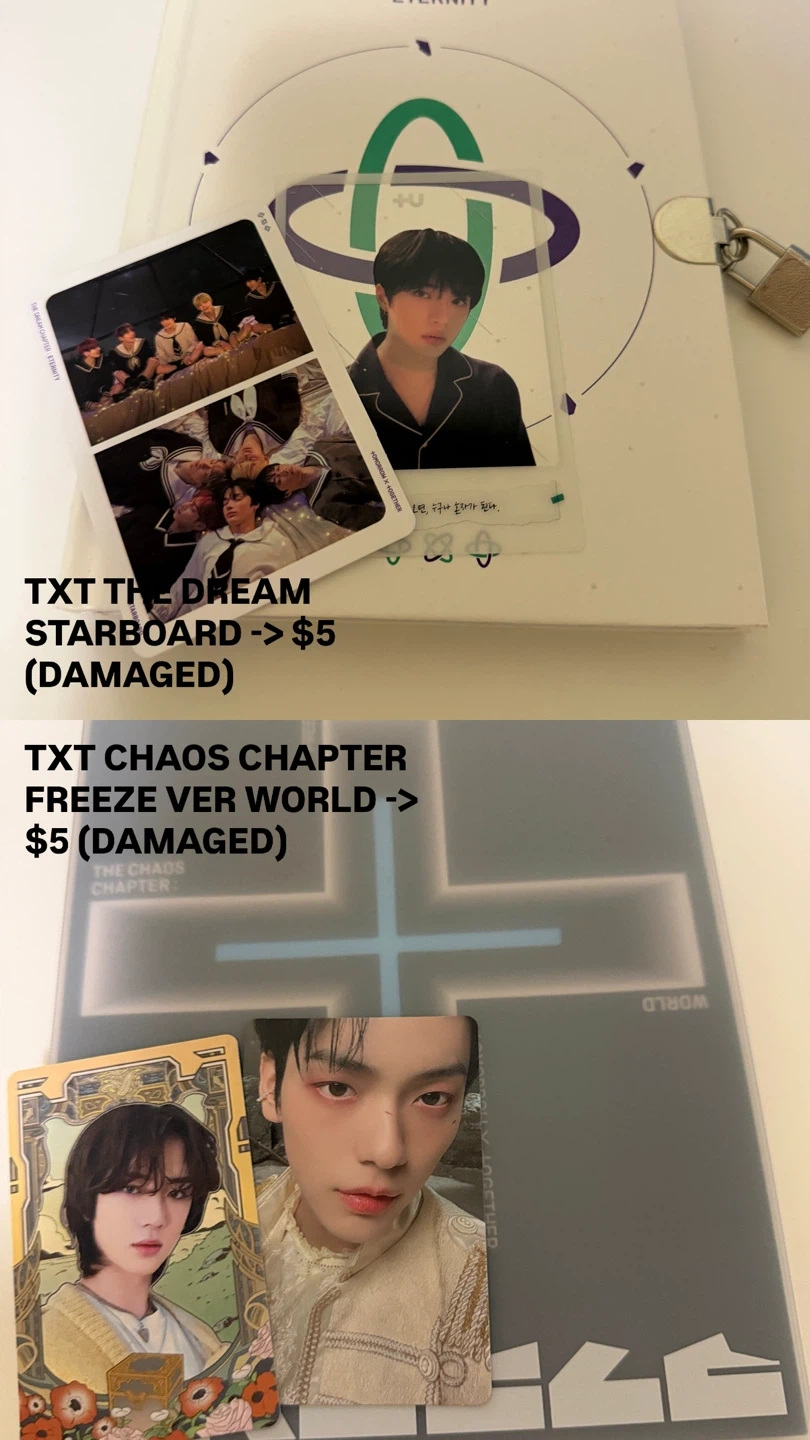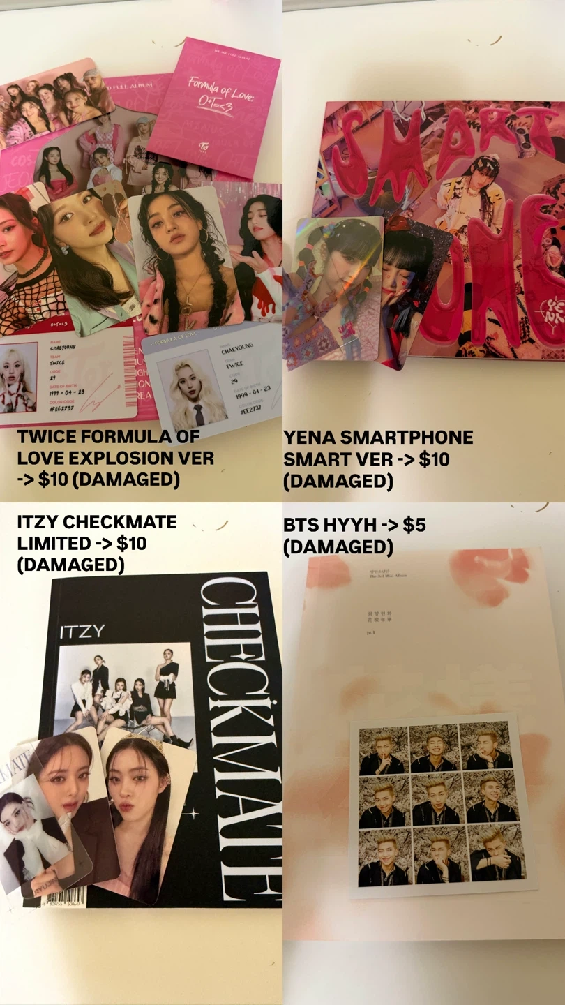 Selling K-pop albums! Some pages are damaged in these albums hence the “Damage” on the photo. Each albums come with the photocards that is shown in the picture and all the inclusion that comes with the album. Prices are shown below and in the photo!