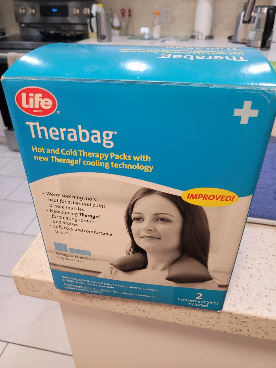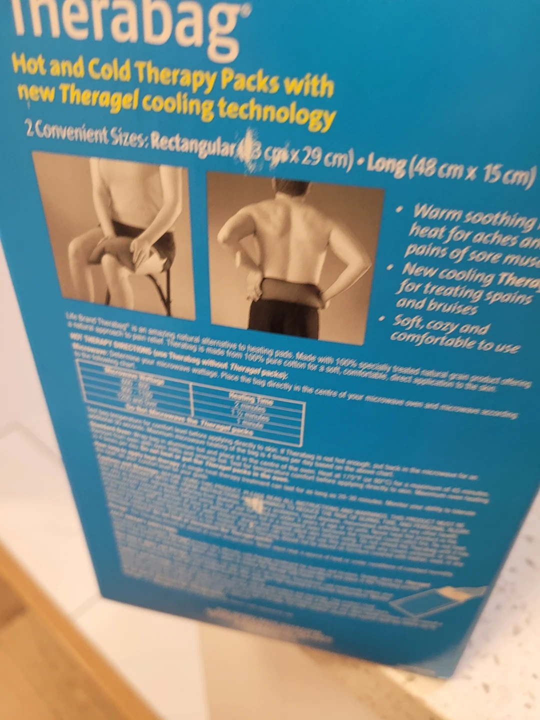This pack offers warm soothing heat for aches and pains and new cooling Theragel for treating sprains and bruises. It's soft, cozy, and comfortable to use. Includes one rectangular pack (23 cm x 29 cm) and one long pack (48 cm x 15 cm).