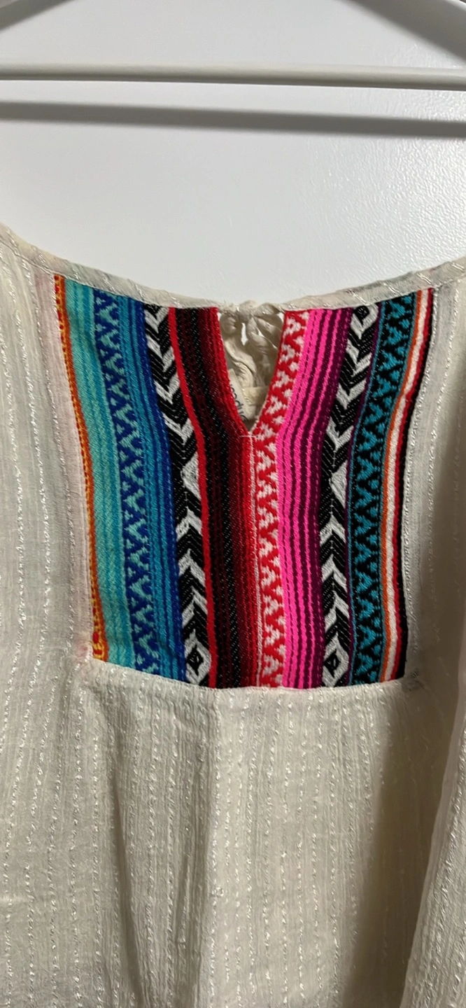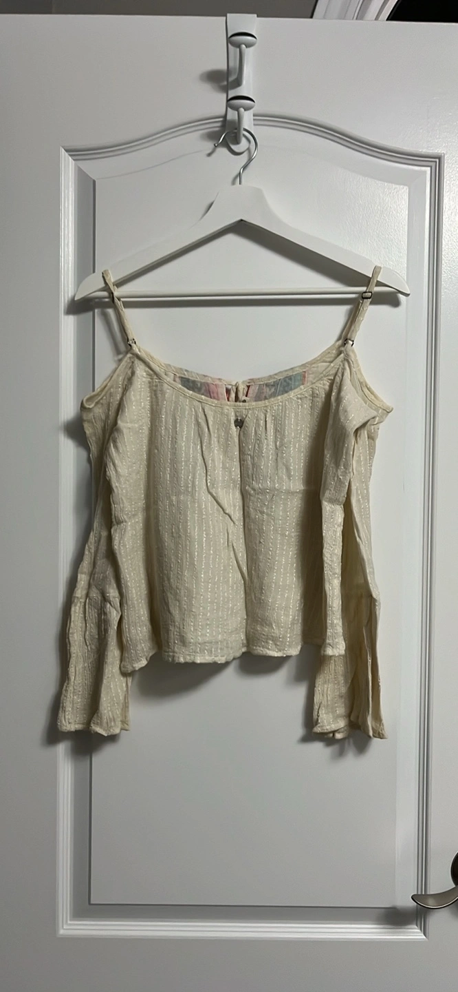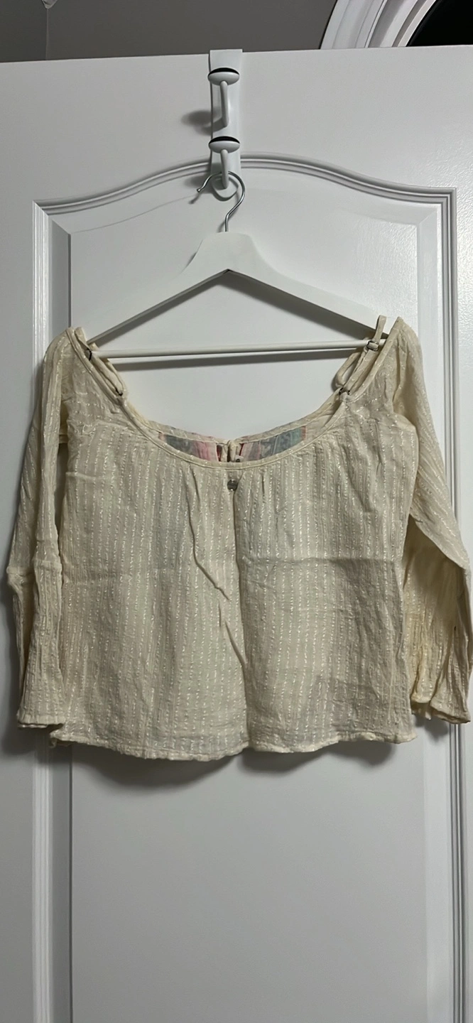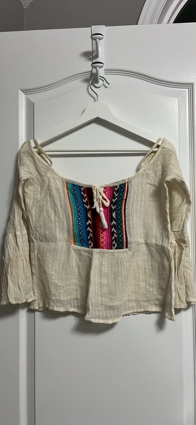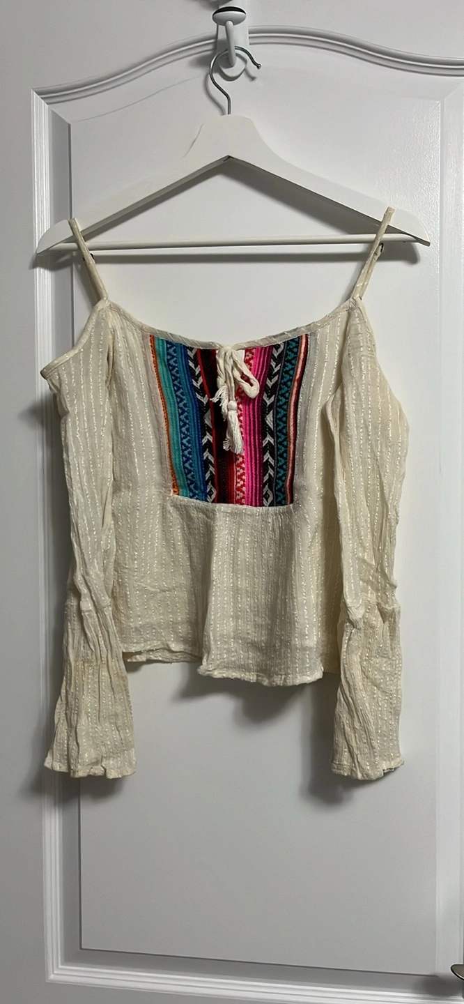Cream coloured peasant top. Off-the-shoulder design. Features embroidered details on the front. Three-quarter sleeves. Relaxed fit with cotton lining.