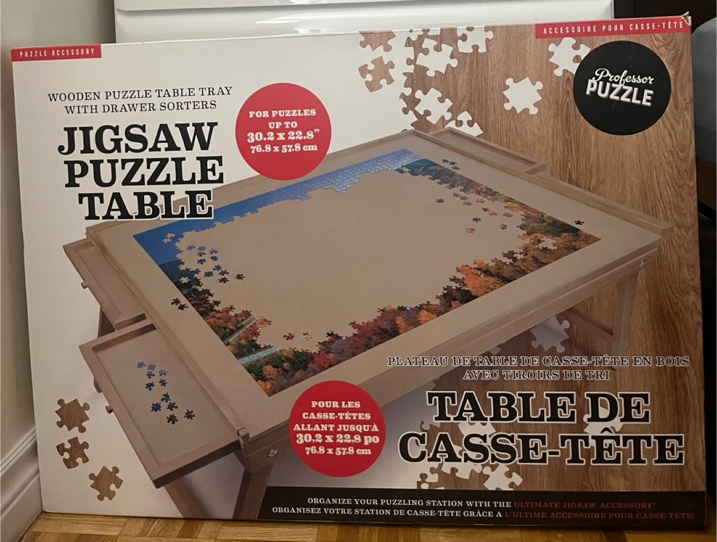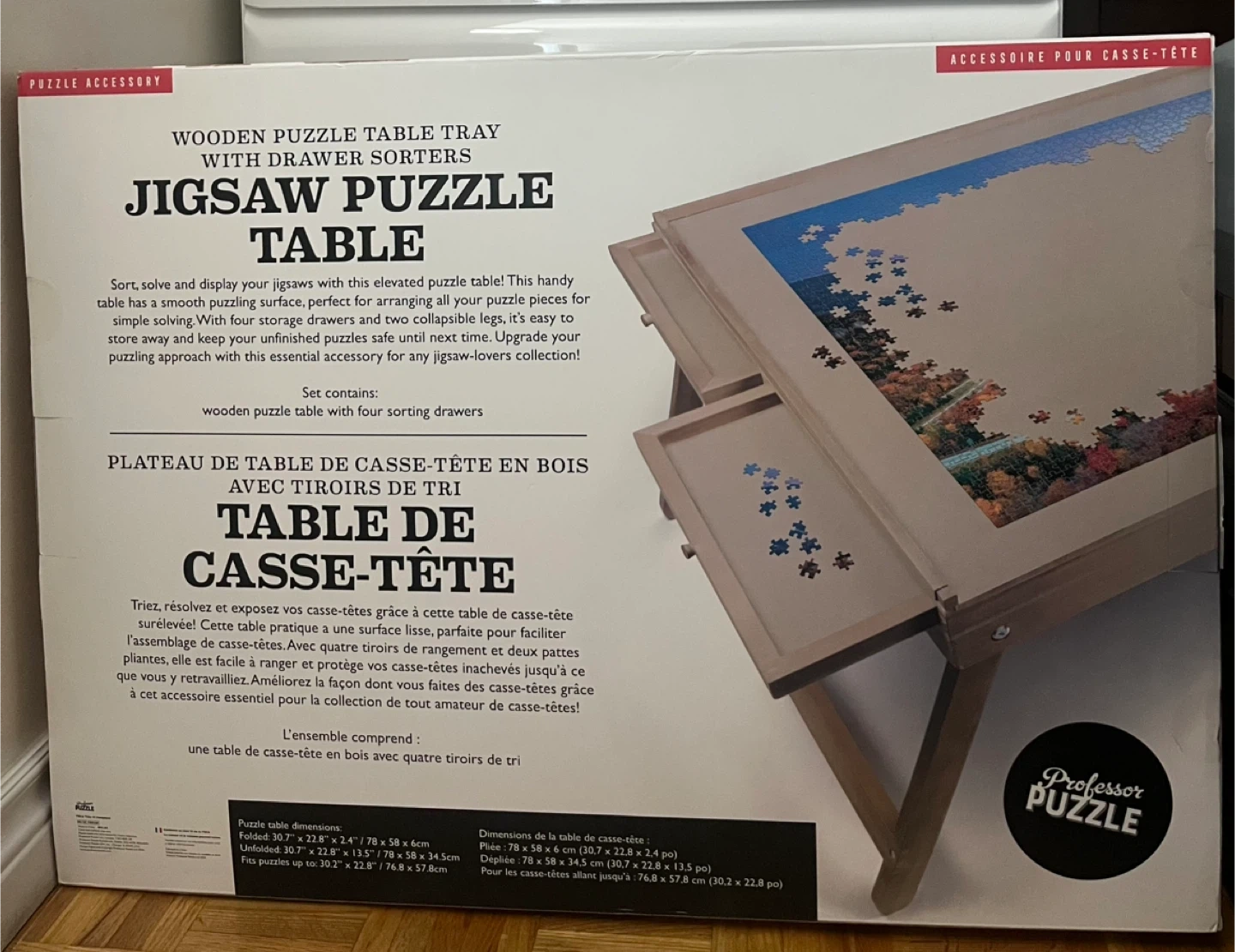 Brand new.This handy wooden puzzle table features a smooth puzzle surface, perfect for arranging your puzzle pieces. It comes with four storage drawers and two foldable legs, making it easy to store away and keep your unfinished puzzles safe.Cash only.