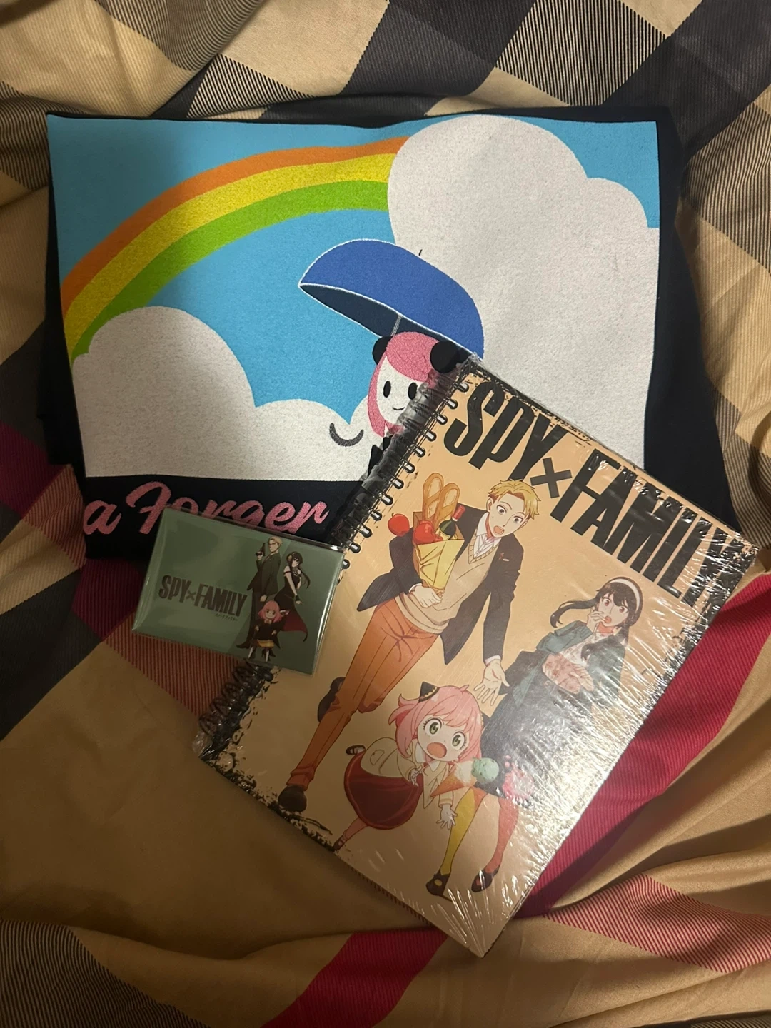 This is a Anya SPY x FAMILY t-shirt, a spiral-bound notebook, magnet, and gift bag