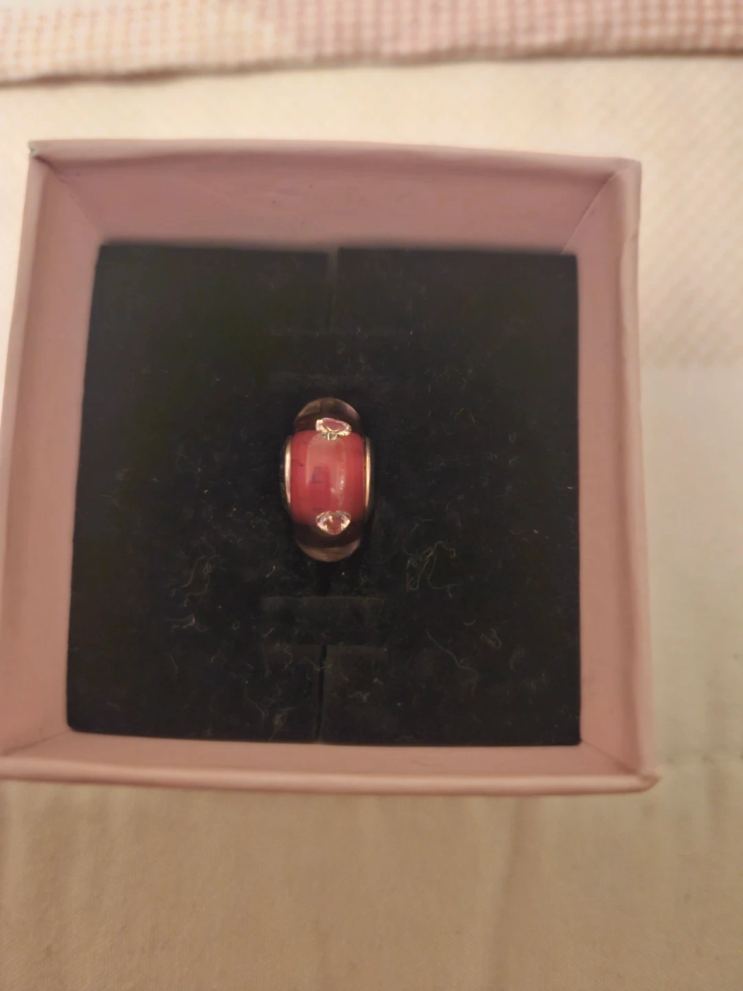 This is a Pandora charm made with red Murano glass. It features small accent stones and the Pandora logo engraved on the metal core. It's a lovely addition to any charm bracelet!