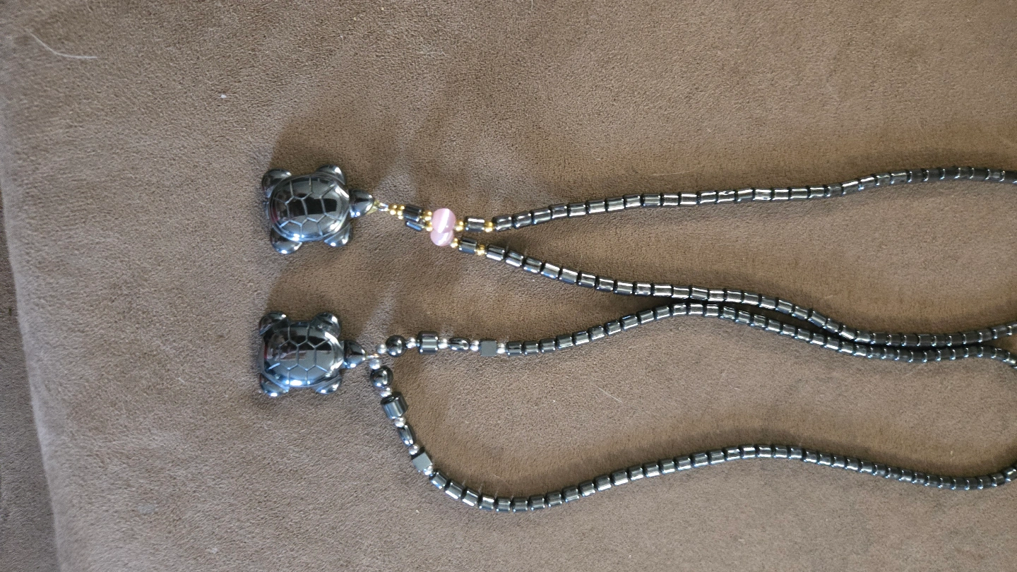 Pair of hematite necklaces. Each features a carved turtle charm. Black hematite beads and gold spacer beads. One necklace includes a light purple bead.