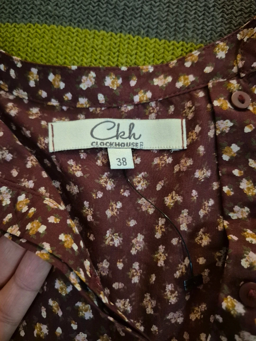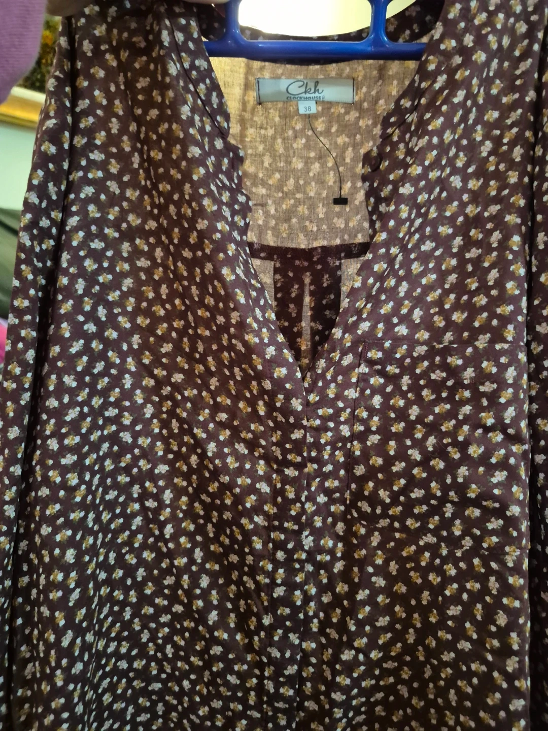 A lovely floral print blouse from Clockhouse. It features a button-up front and a collared neckline. The bottom of the shirt is longer in the back!
