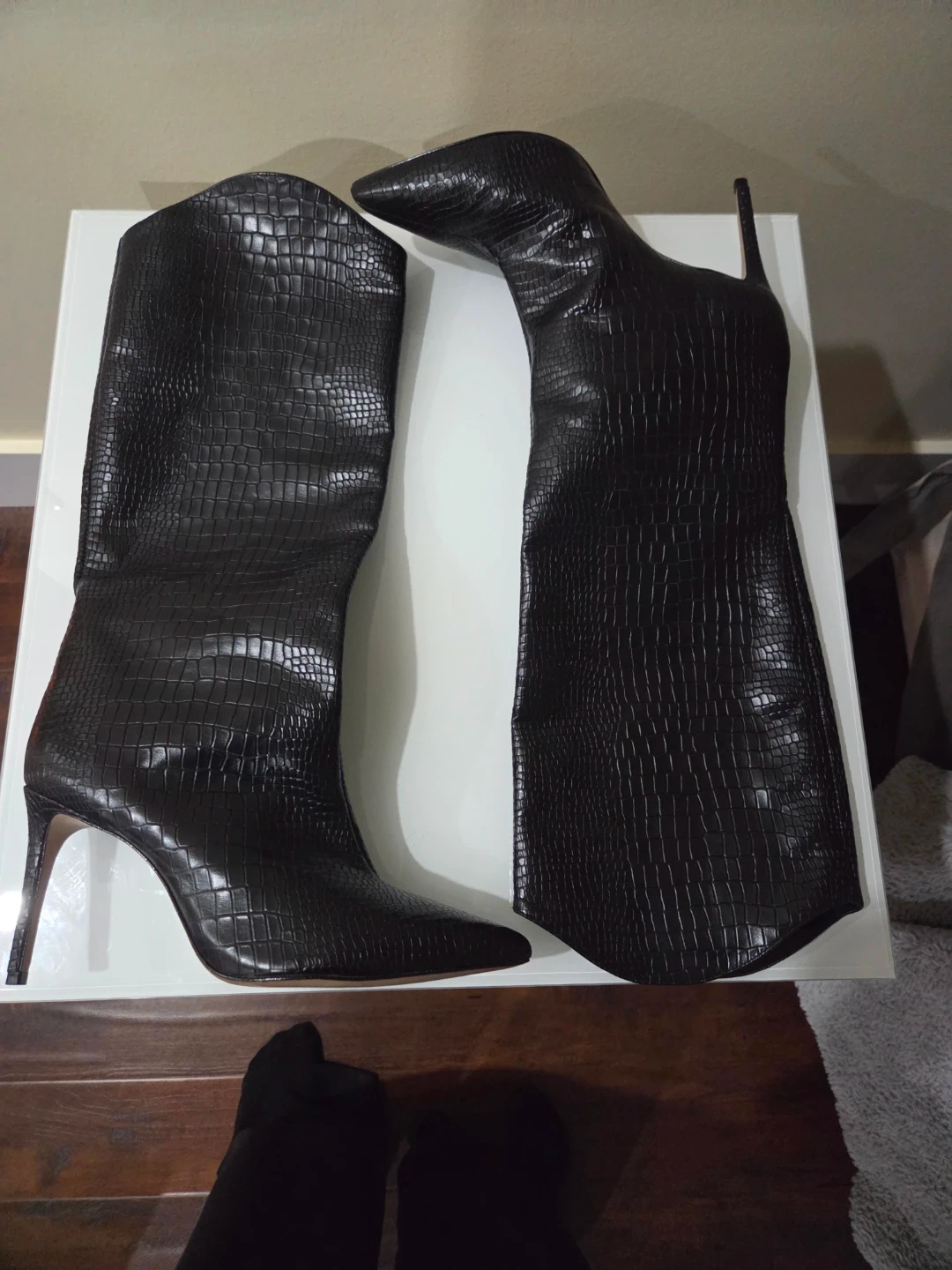 These are Schutz black embossed leather heeled boots. They feature a pointed toe and a stiletto heel. Made in Brazil with a leather sole.