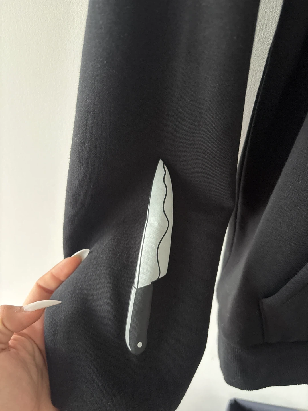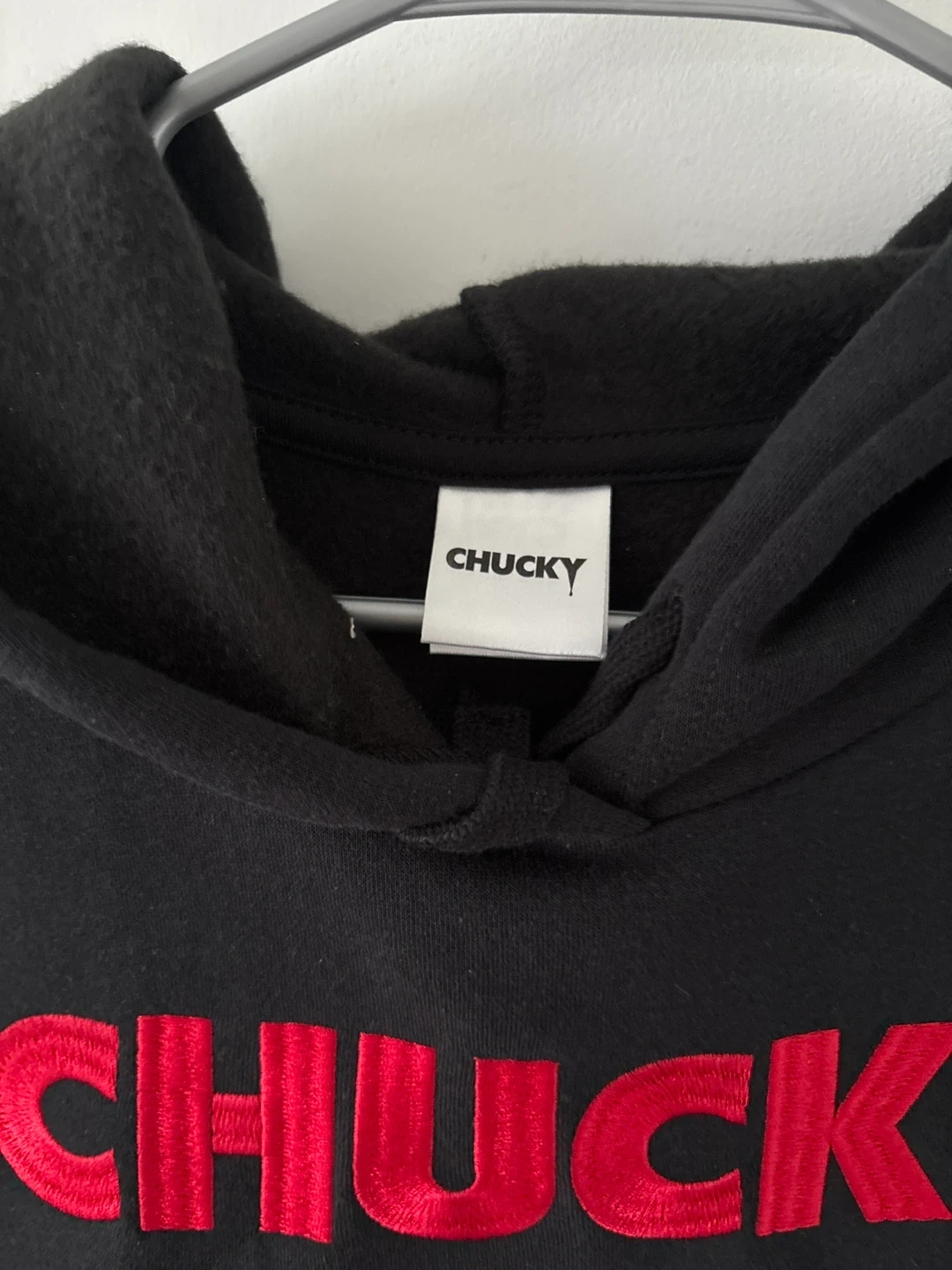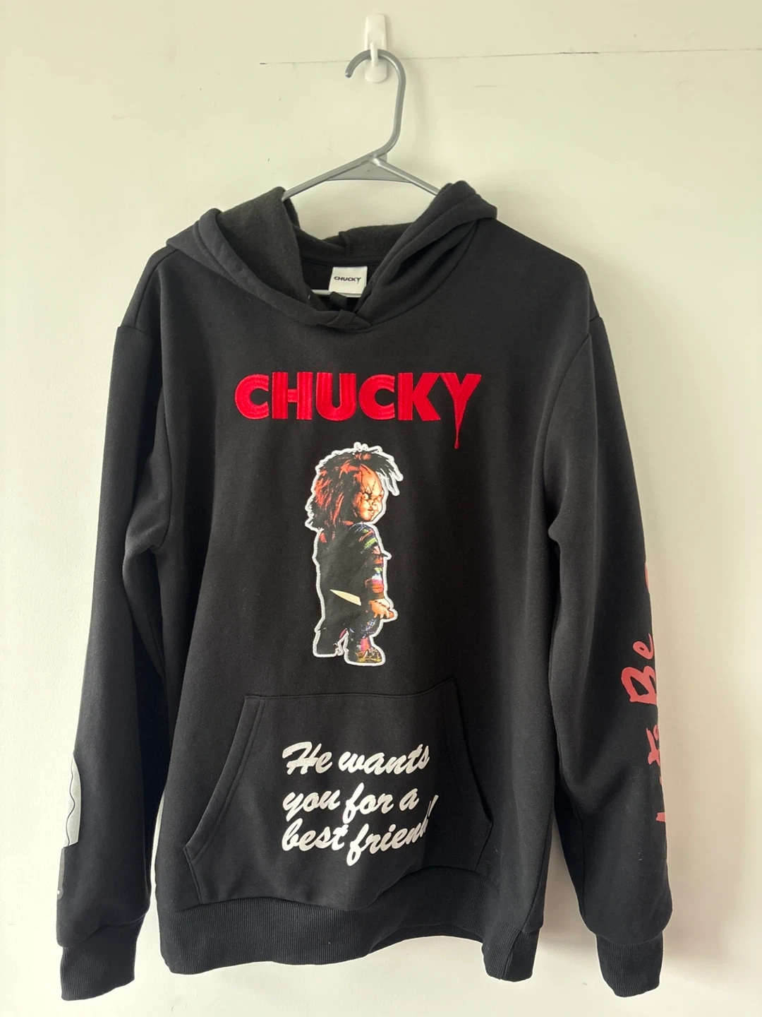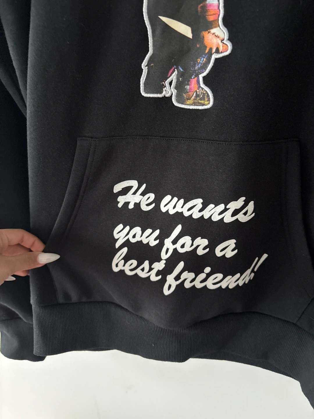 Black hoodie featuring Chucky graphic with "He wants you for a best friend!" text. Includes graphic on sleeve. Great detail. Soft material. Never worn.