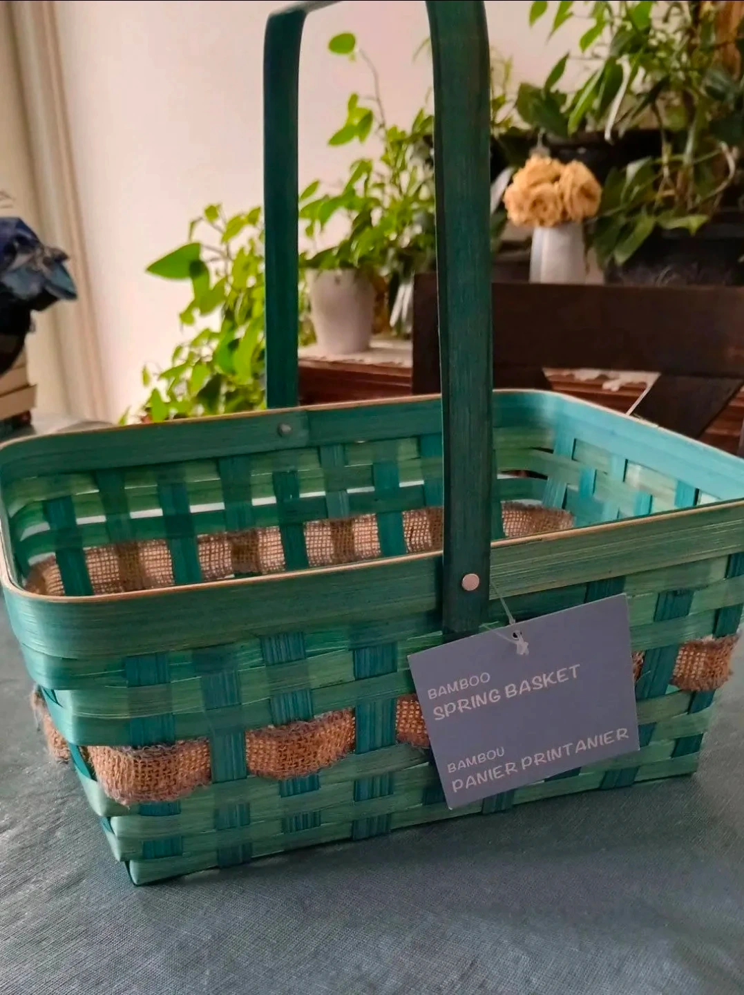 This is a bamboo spring basket, perfect for carrying Easter treats or springtime finds. It features a durable woven bamboo construction with rustic burlap accents. It's great for collecting eggs or displaying seasonal decorations!