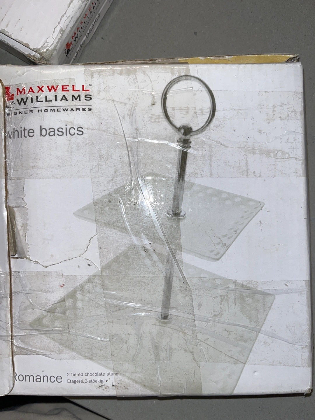 Two tiered chocolate stand with a silver base and white glass tiers. The stand is in the 'romance' pattern.