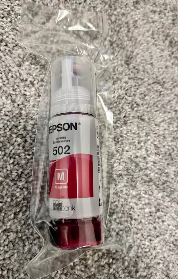 Sealed Epson 502 EcoTank ink bottle. Magenta color.