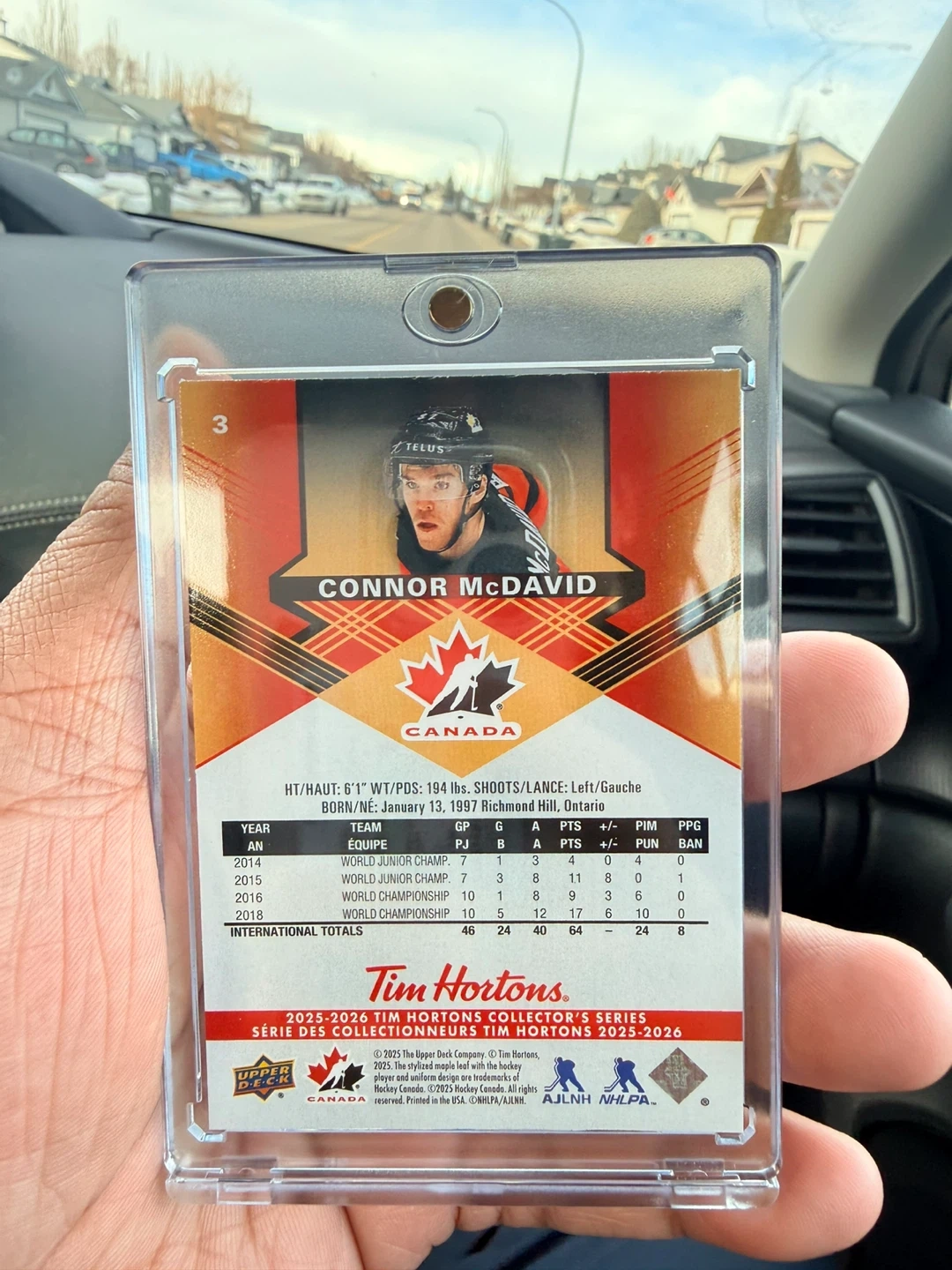 This is a 2022-2026 Upper Deck Tim Hortons Collector's Series hockey card featuring Connor McDavid. The card is protected in a clear toploader.