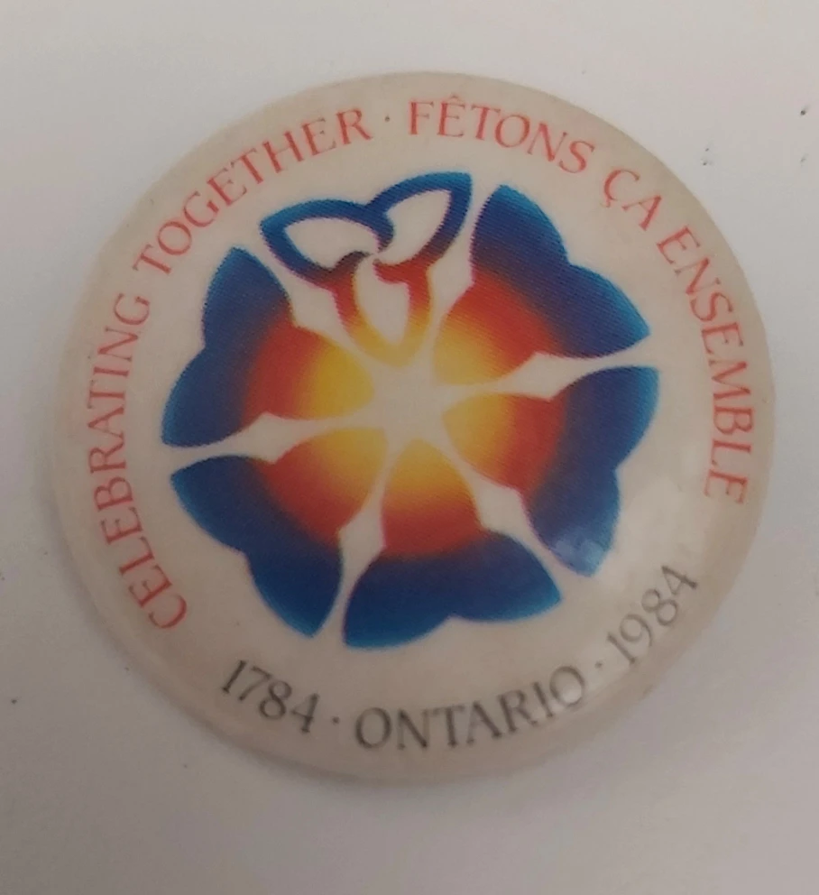 Vintage pin celebrating Ontario together, dated 1984. The pin features a colourful design with text in both English and French.