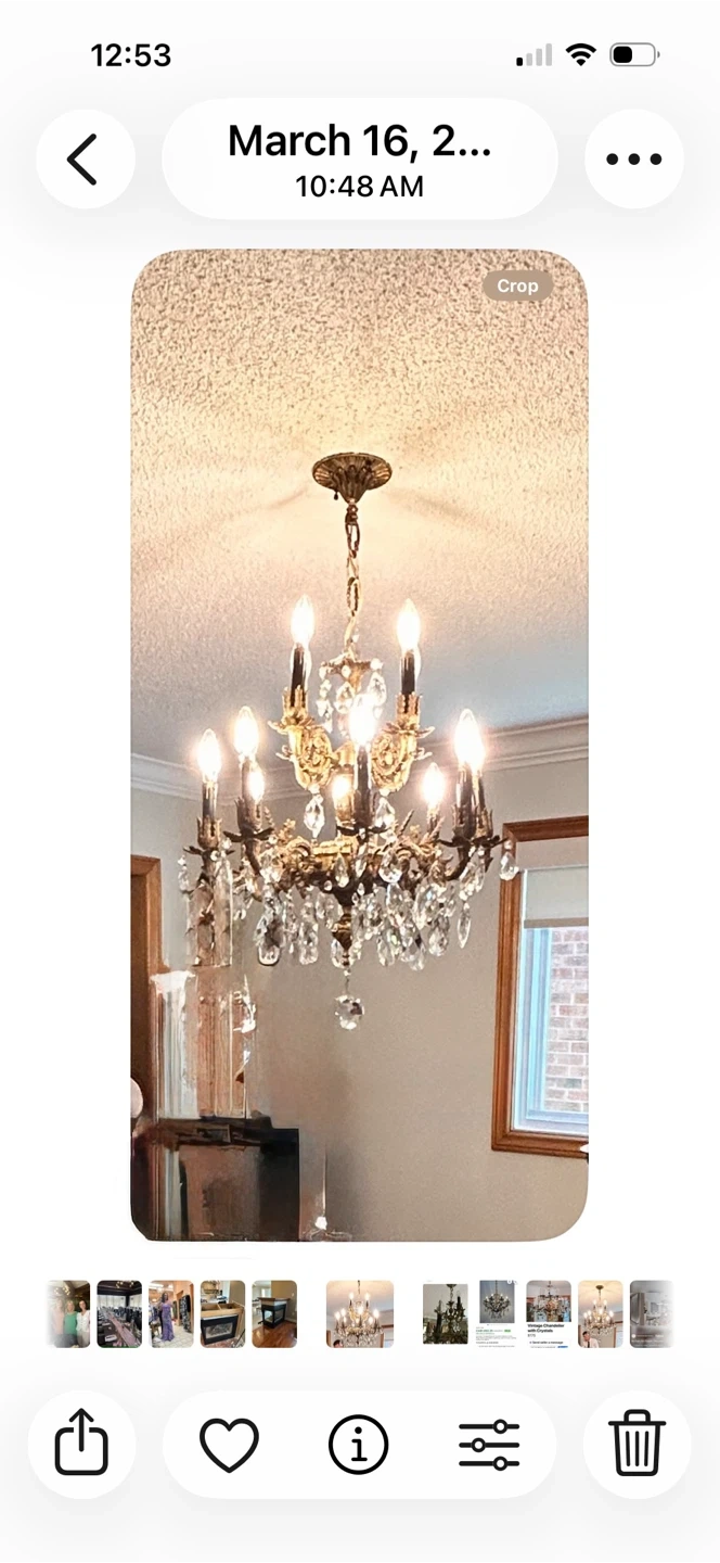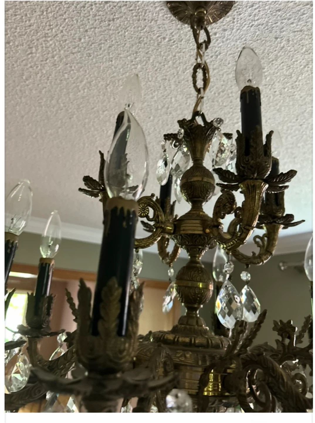 Beautiful vintage-style brass chandelier featuring ornate detailing and sparkling crystal droplets. It's perfect for adding a touch of elegance to any dining room or entryway. This fixture includes multiple candle-style lights.