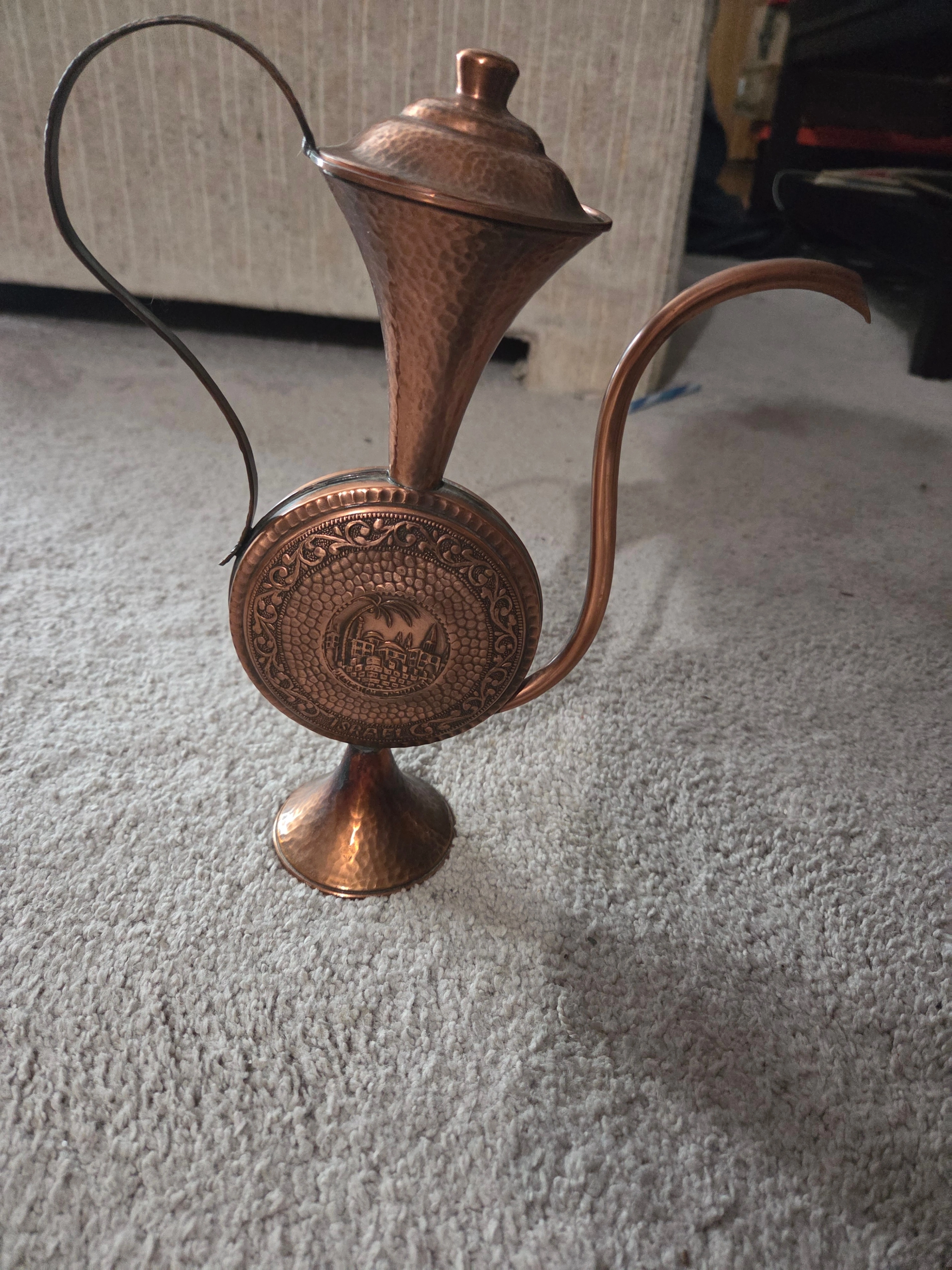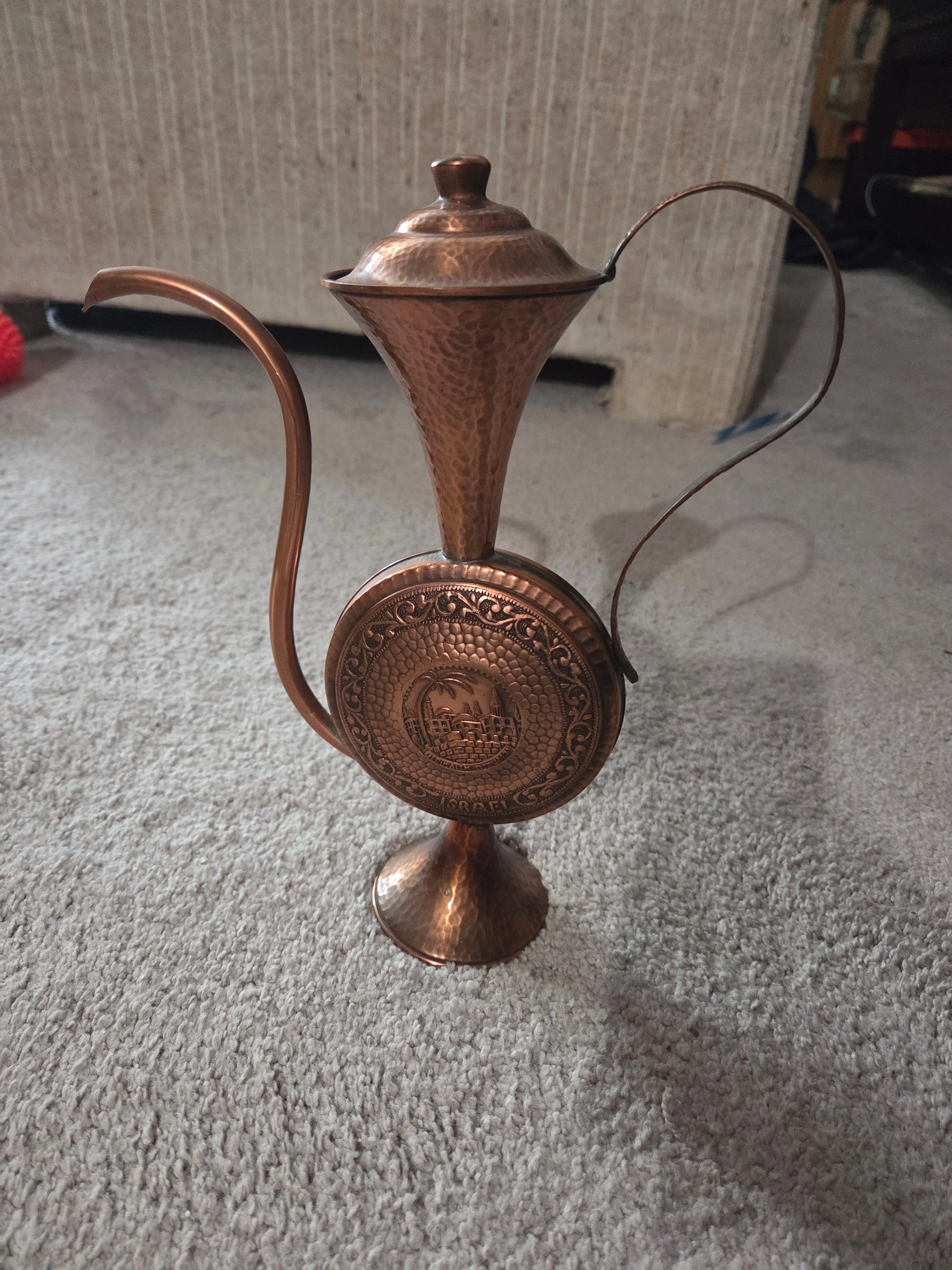 Beautiful vintage hand-hammered copper pitcher (or decorative teapot) standing 10 inches tall. This authentic mid-century piece was handcrafted in Israel and features an embossed circular emblem on both sides depicting a historical scene (Jerusalem/Jaffa port motif).
