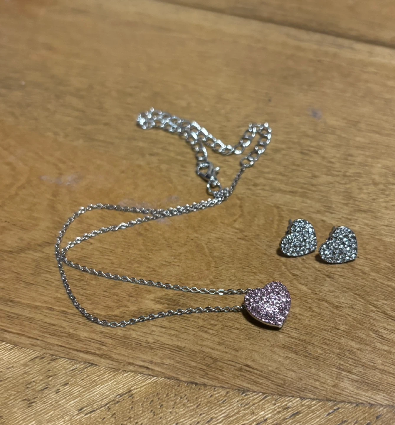 This jewelry set includes a silver-tone necklace with a pink heart pendant and stud earrings. The pendant and earrings are adorned with clear and pink rhinestones. A sweet addition to any outfit!