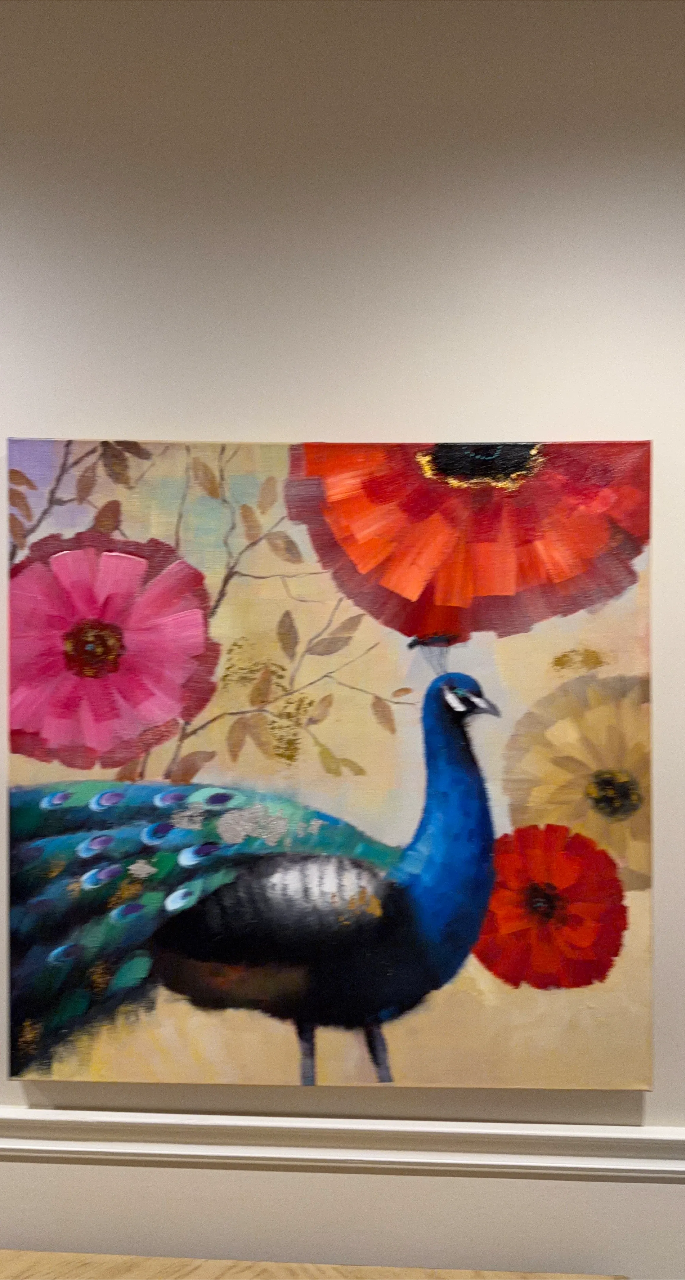 Canvas art print featuring a peacock with vibrant floral accents. Textured details add depth to the piece. Measures approximately 39”x39”. Pick up from Hillcrest mall.