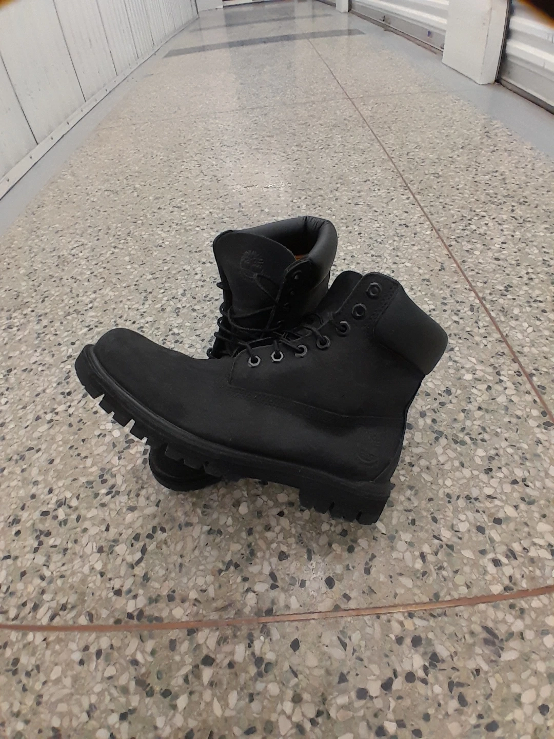 Classic black Timberland lace-up boots. Durable construction with a thick tread sole for traction. These boots are a staple for any season men's size 8