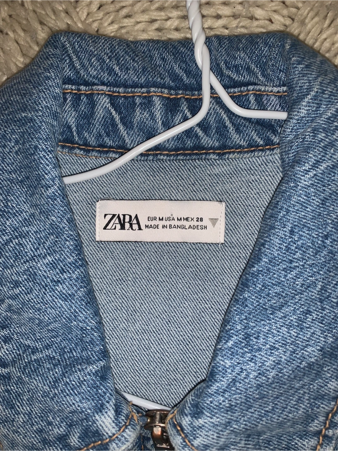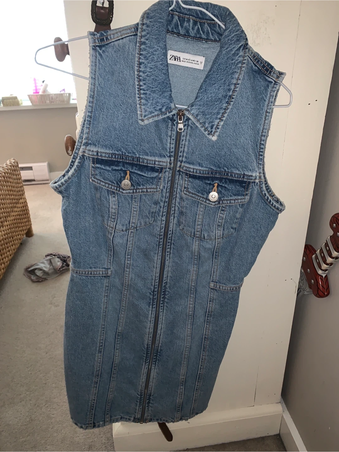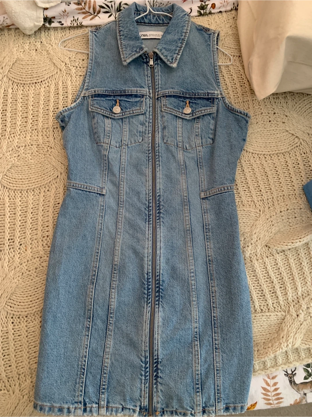 ZARA sleeveless denim dress with a front zipper closure. It's made of durable denim material and features two chest pockets. Size M, which is equivalent to US 28. This versatile dress is perfect for a casual day out!
