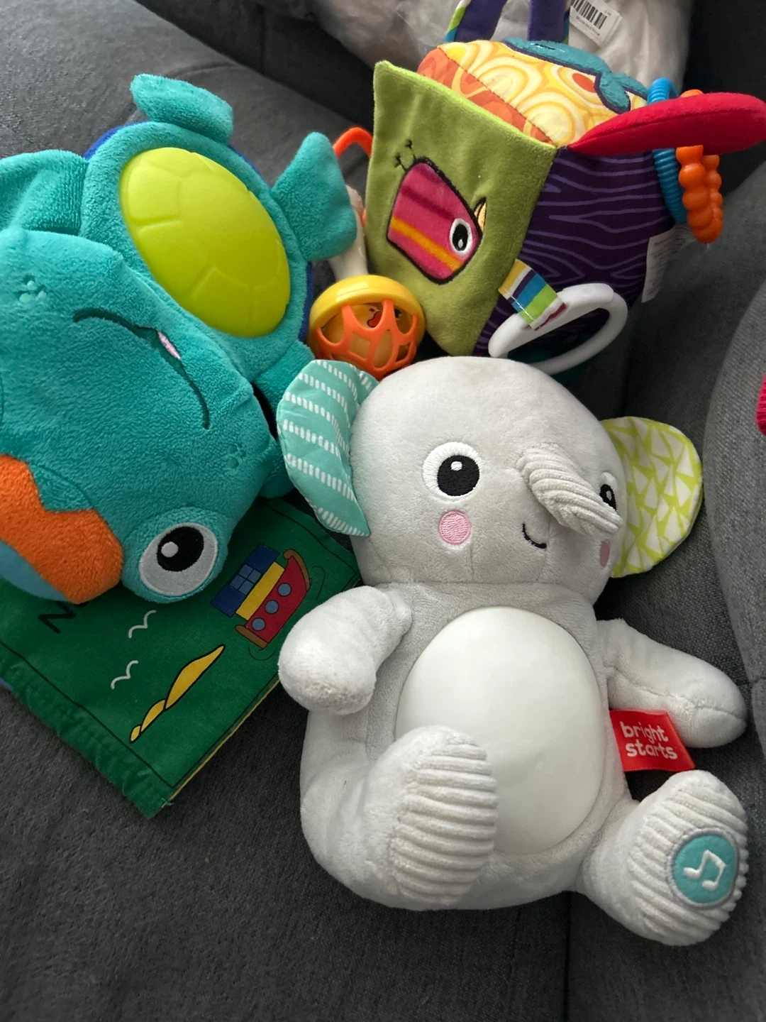 This lot includes several baby toys, such as a Bright Starts plush elephant, a seahorse rattle, and three pacifiers in white, pink, and rose. The elephant has a soft plush exterior and plays music. The pacifiers are made of silicone.