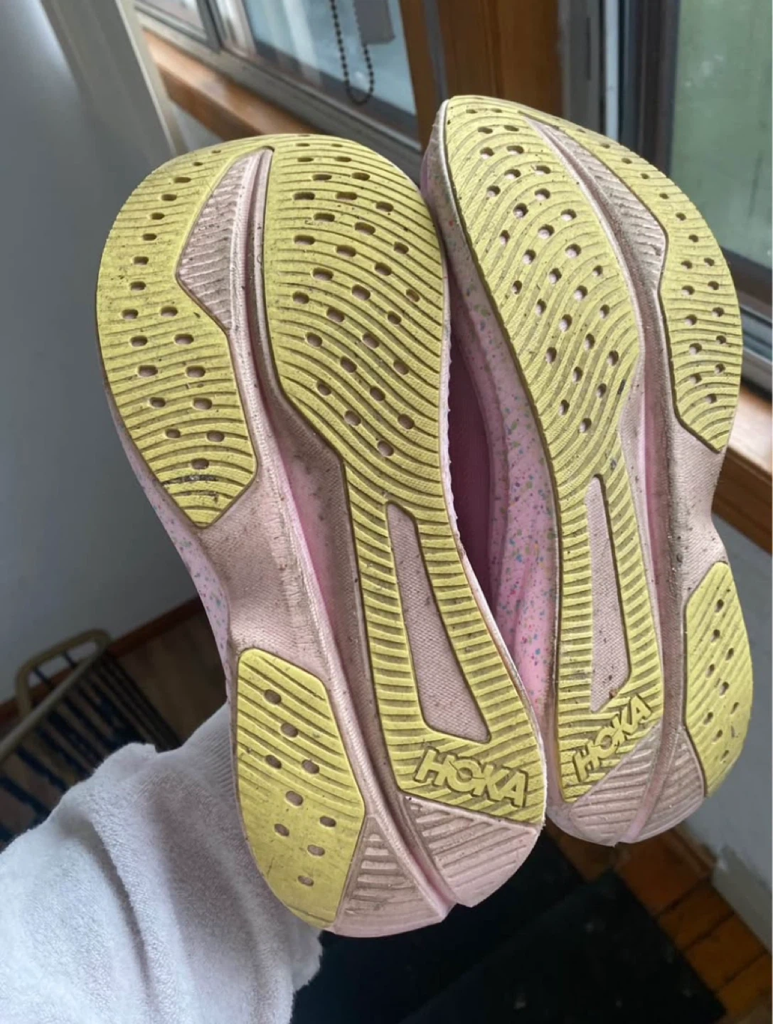 These are pink Hoka running shoes. They have a speckled midsole and yellow soles. They're great for hitting the pavement!