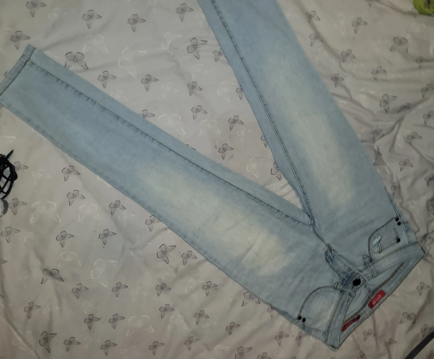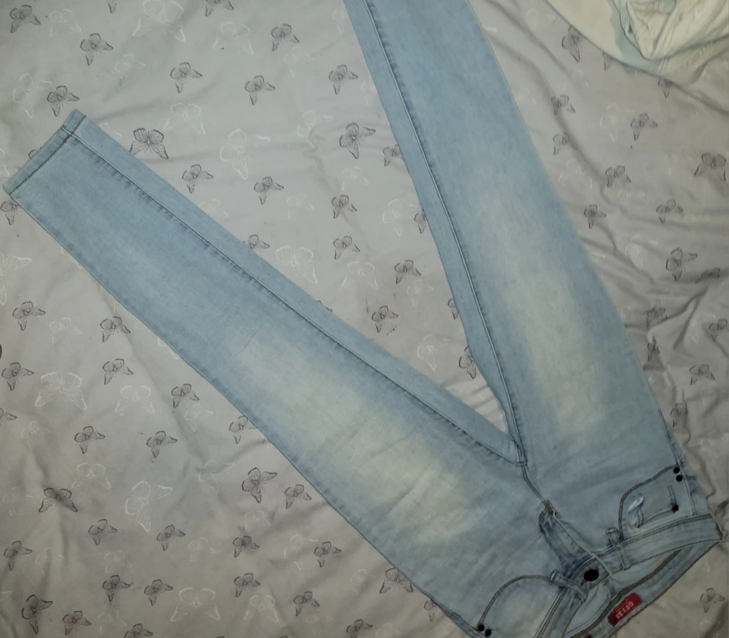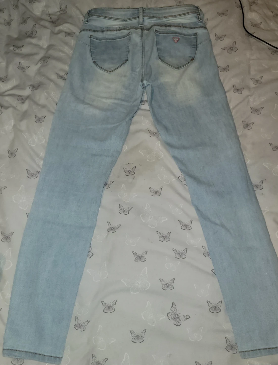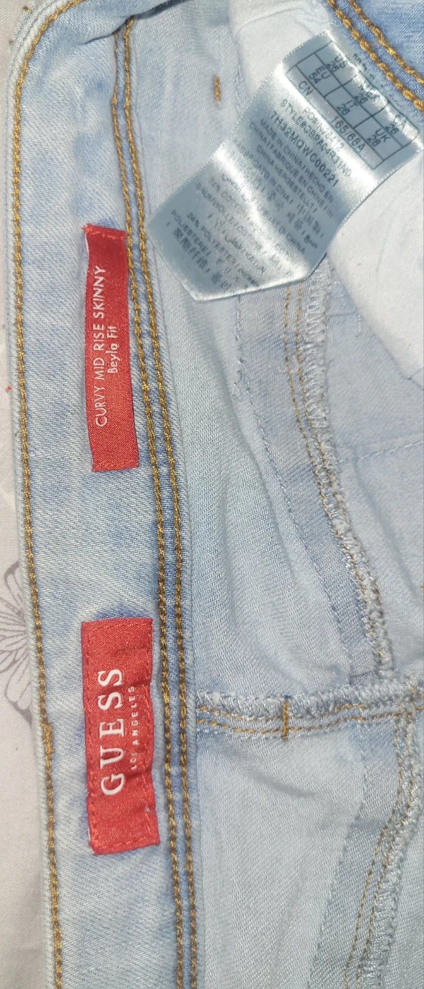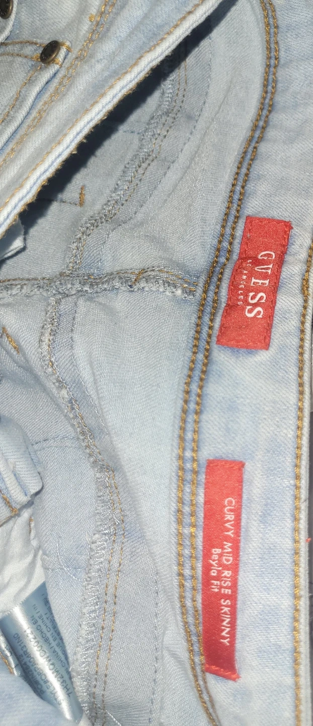Guess denim jeans in a light wash. These are a curvy mid-rise skinny fit, size 28x32. Made with 75% cotton, 23% polyester, and 2% spandex for comfort. A versatile pair of jeans for any occasion!