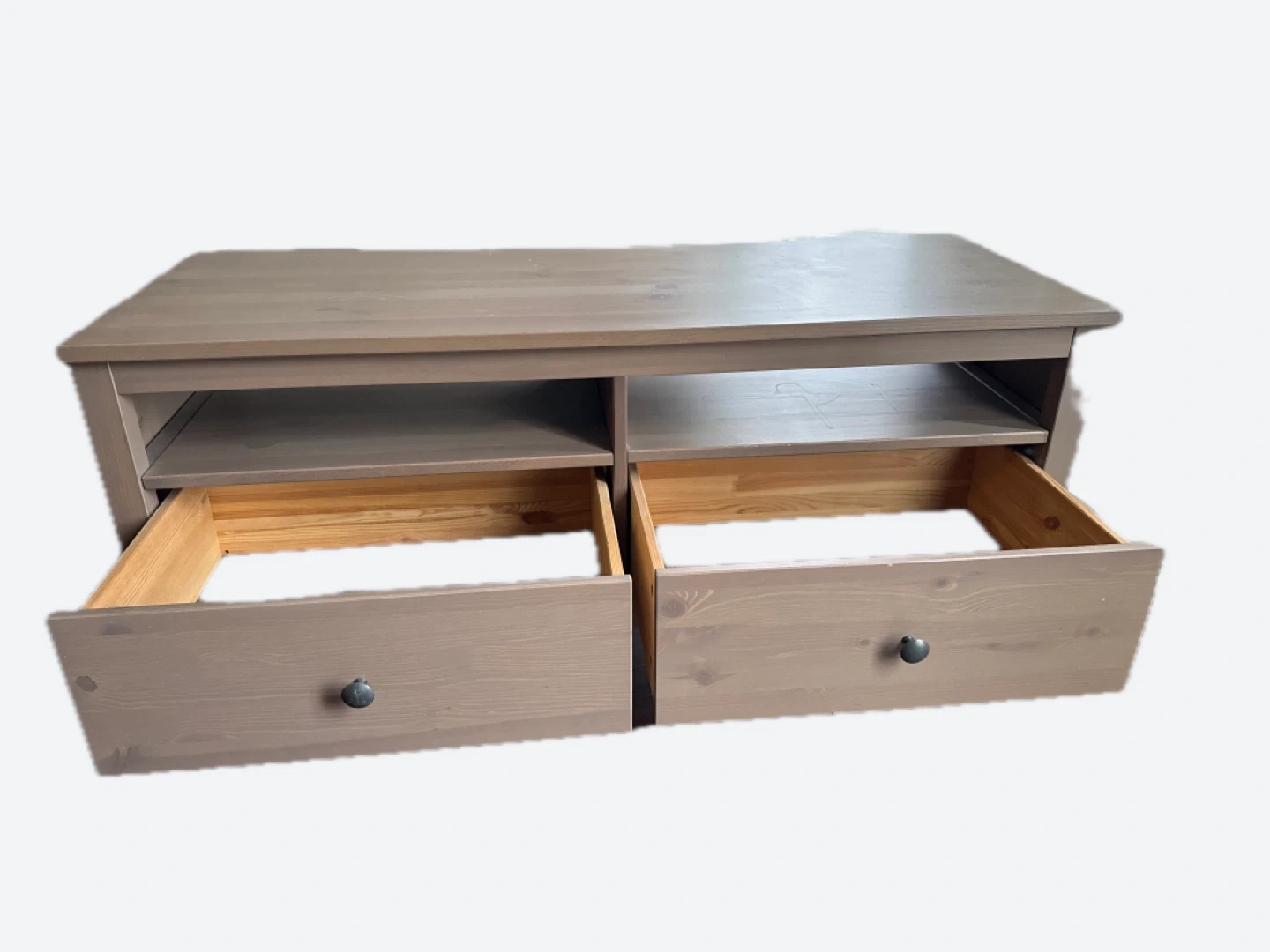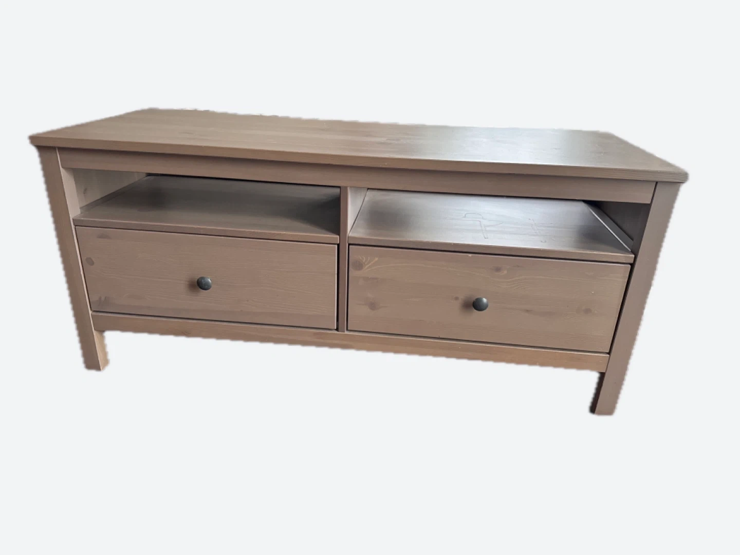 Selling a used IKEA Hemnes TV stand in a brown/gray color. It has some signs of use but is still in good condition. Perfect for your living room setup!