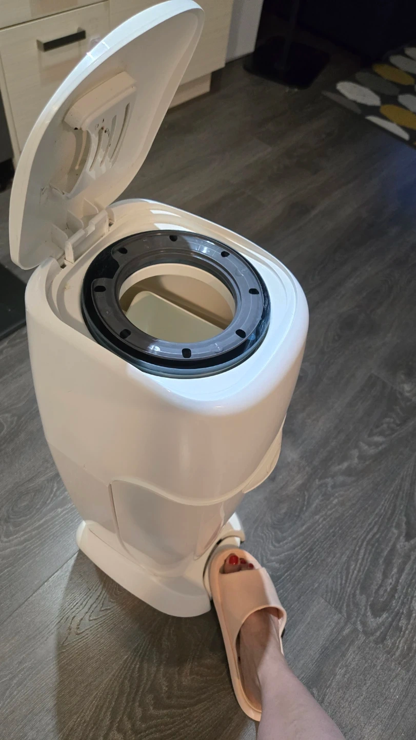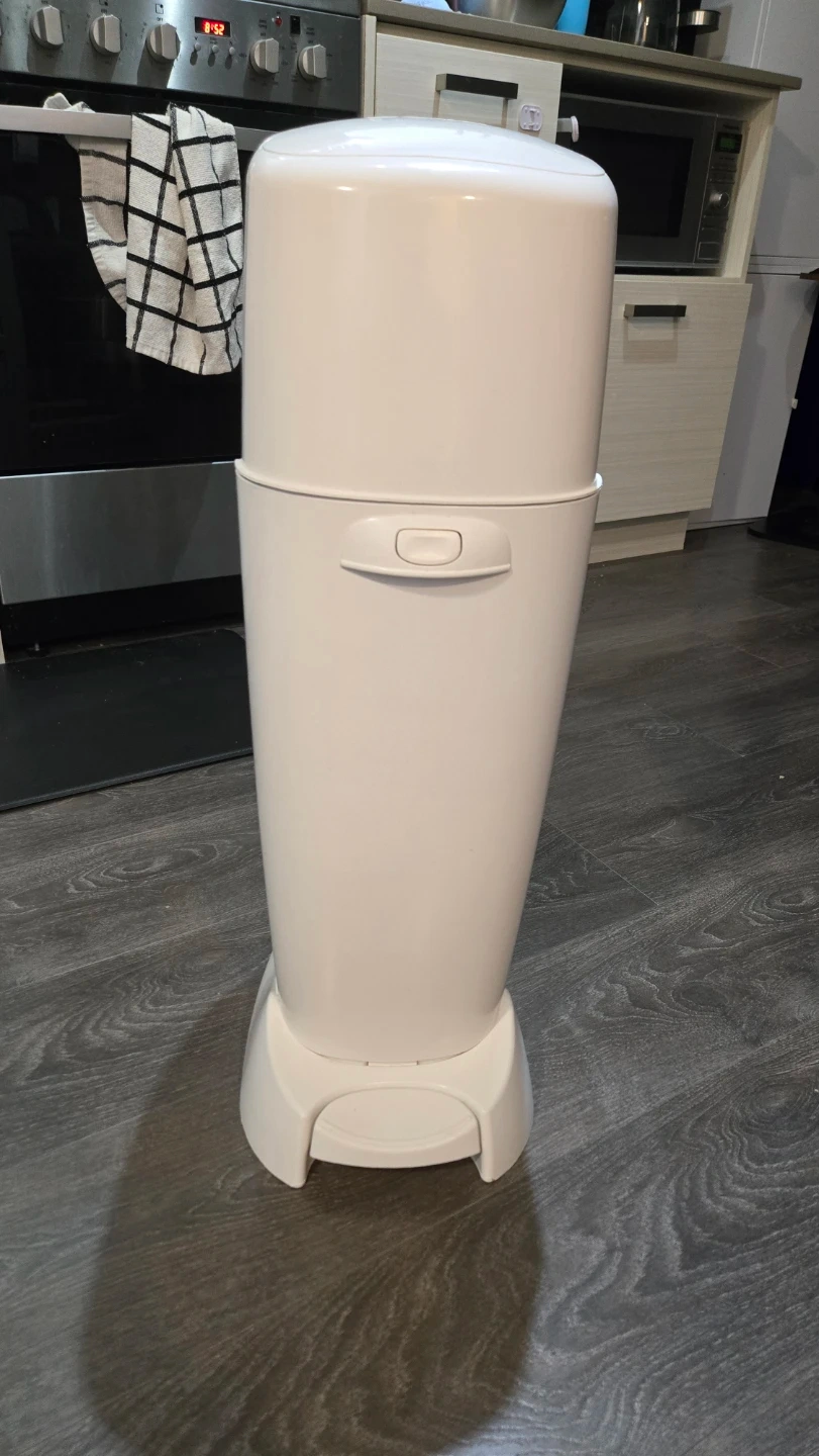 This is a white Playtex Diaper Genie Complete diaper pail. It features a foot pedal for hands-free operation. It's designed to help control odours and makes diaper disposal easy. Pickup at Yonge-Eglinton area. Cash only.
