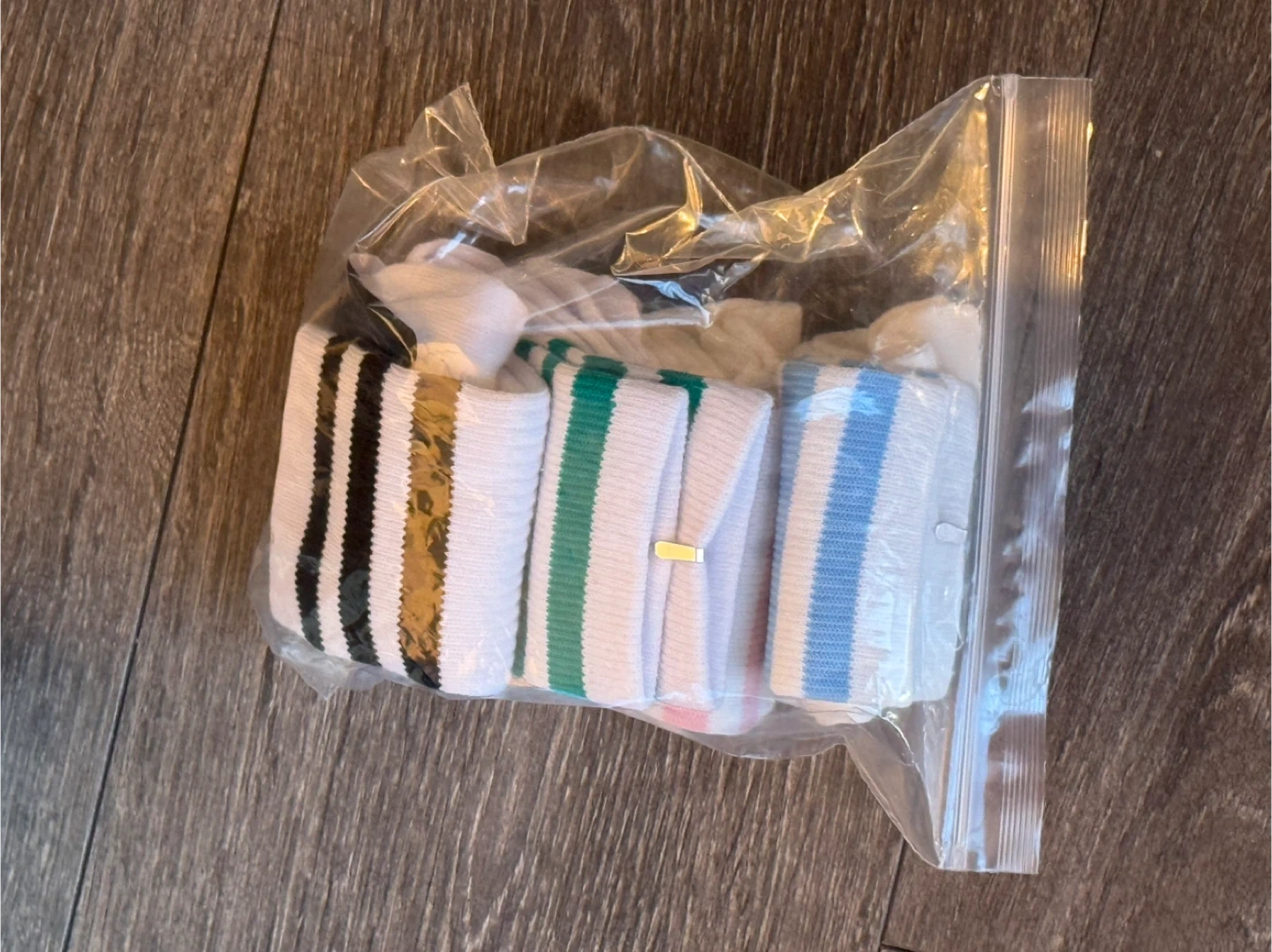 Four pairs of crew socks included in the pack. Features white socks with sporty stripes in black/gold, green, and blue. One size fits most.