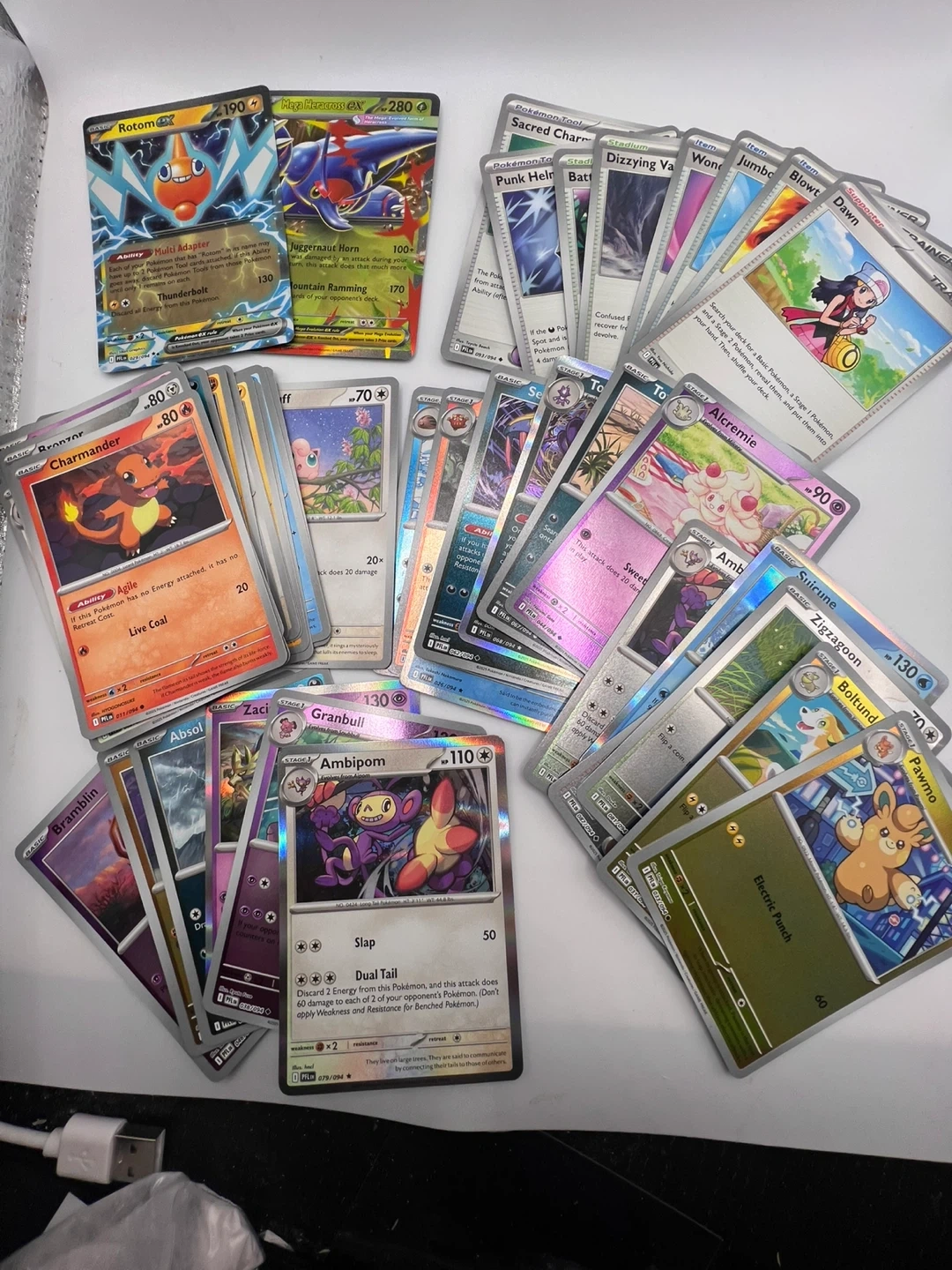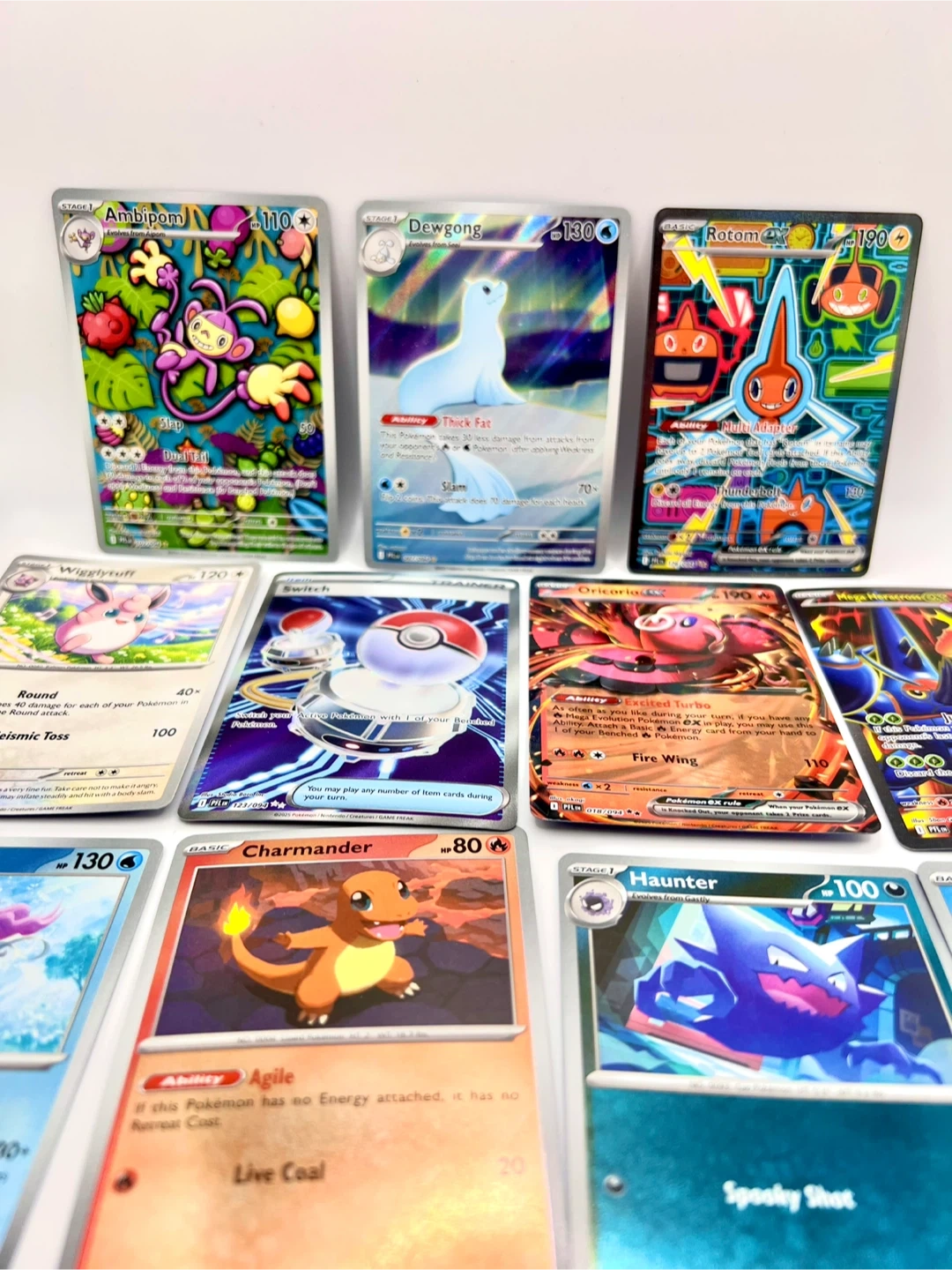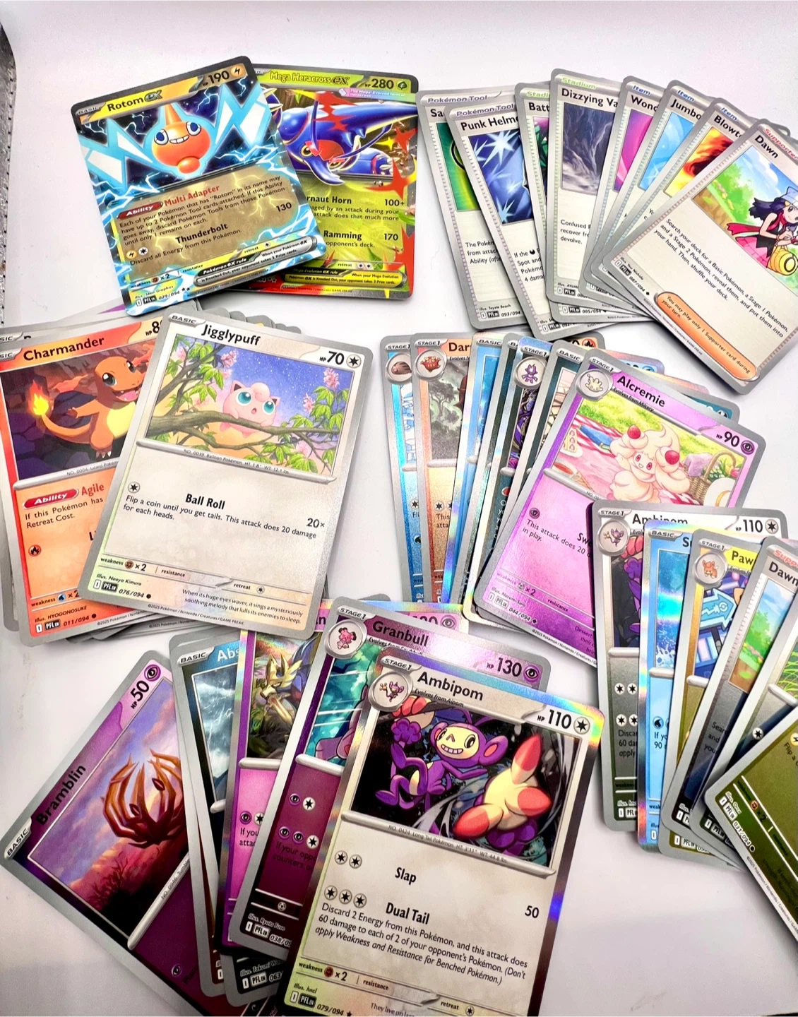 Collection of various Pokémon TCG cards. Includes Holo Rares and EX cards. Cards feature popular Pokémon like Rotom EX, Oricorio EX, and Mega Heracross EX. Great for collectors and players!