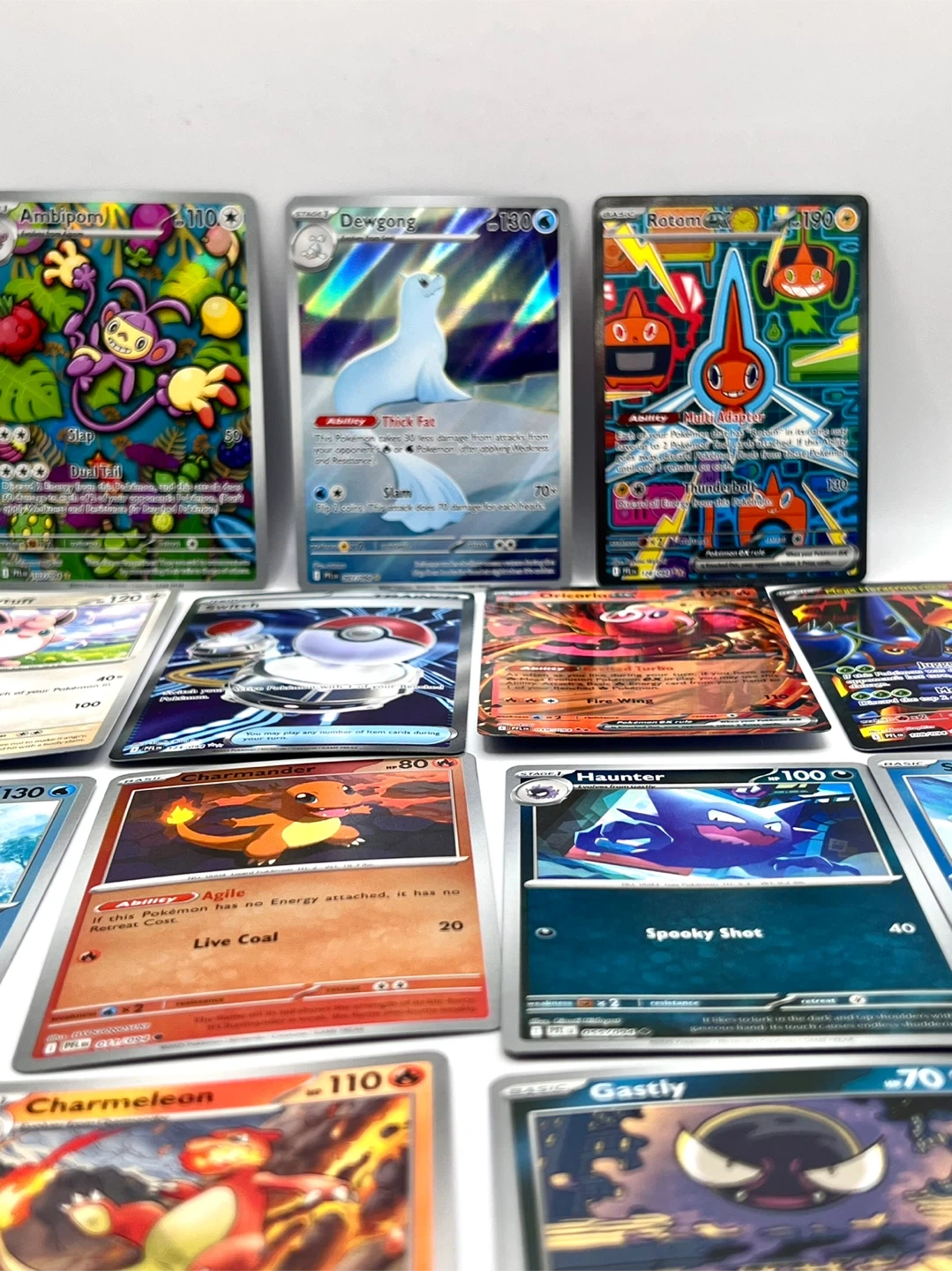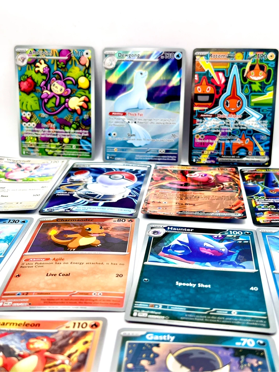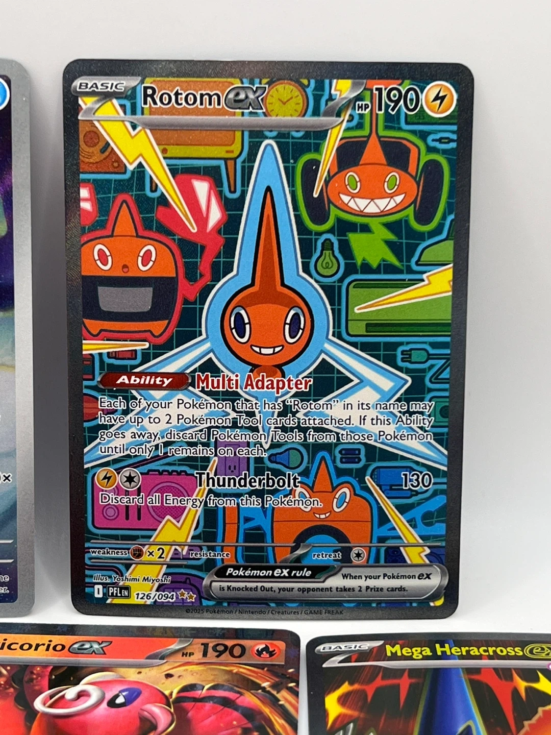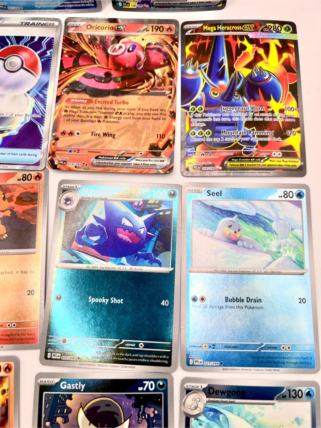 Collection of various Pokémon TCG cards. Includes Holo Rares and EX cards. Cards feature popular Pokémon like Rotom EX, Oricorio EX, and Mega Heracross EX. Great for collectors and players!