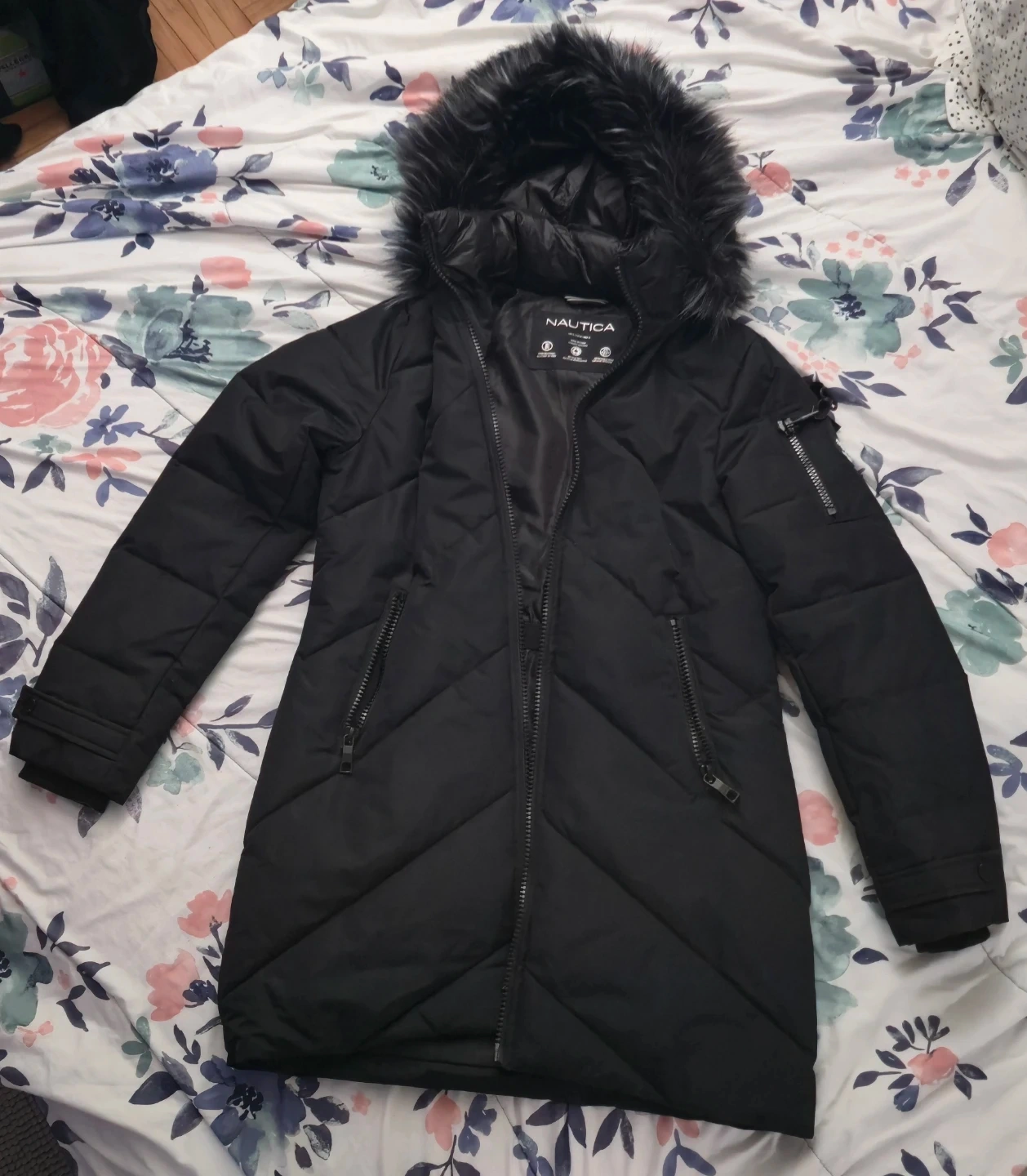 This Nautica puffer coat is black and features a detachable hood with faux fur trim. It's wind-resistant and made with recycled fill. The jacket has multiple zippered pockets.