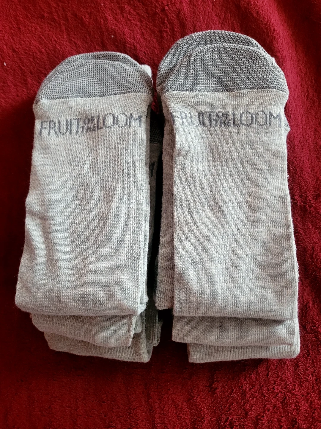 Brand new pack of six grey crew socks from Fruit of the Loom. These socks are made with a comfortable blend and feature reinforced heels and toes for durability. They're perfect for everyday wear!
