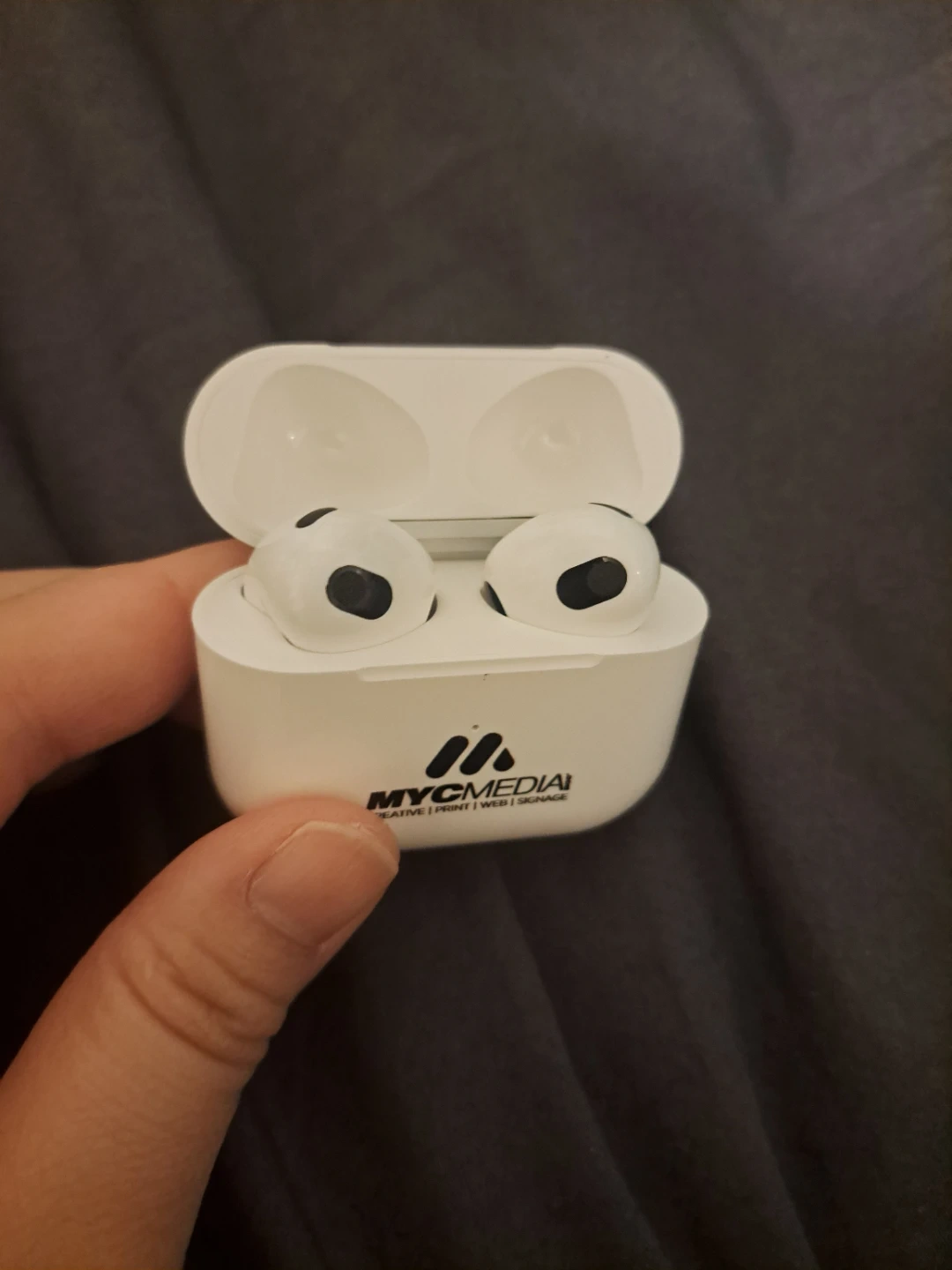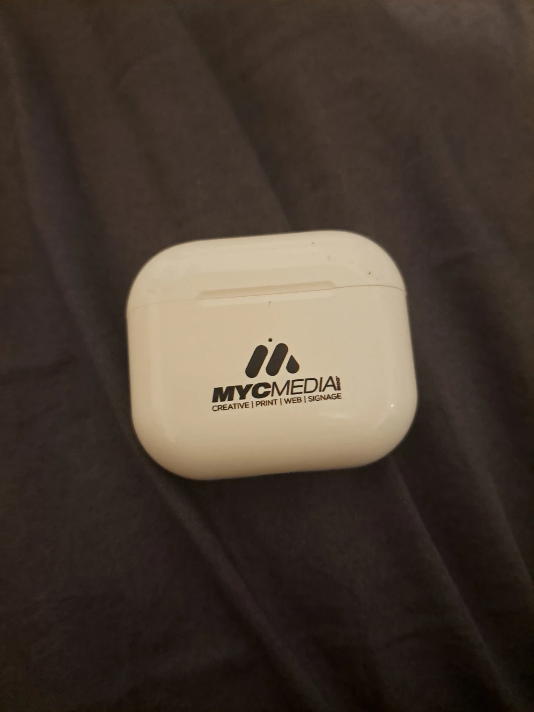 White wireless earbuds with a charging case featuring the MYCMEDIA logo. Includes earbuds and charging case.
