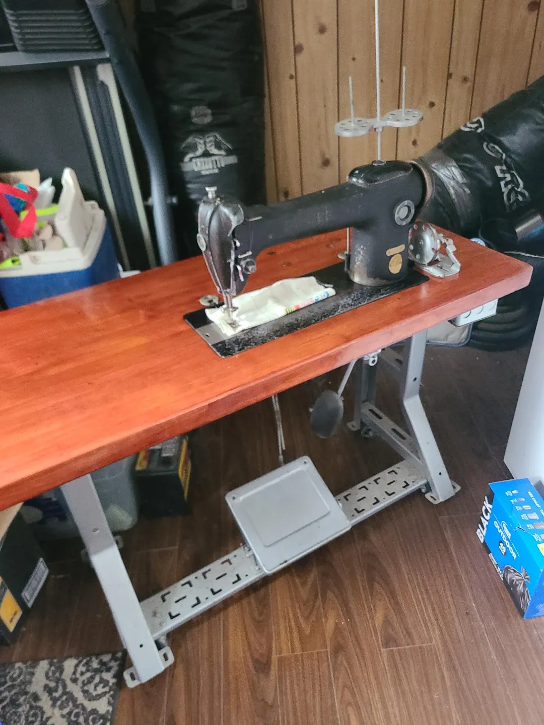 This is a vintage sewing machine with a wooden table and foot pedal. The machine appears to be in good condition for its age. It's a classic piece for any sewing enthusiast.