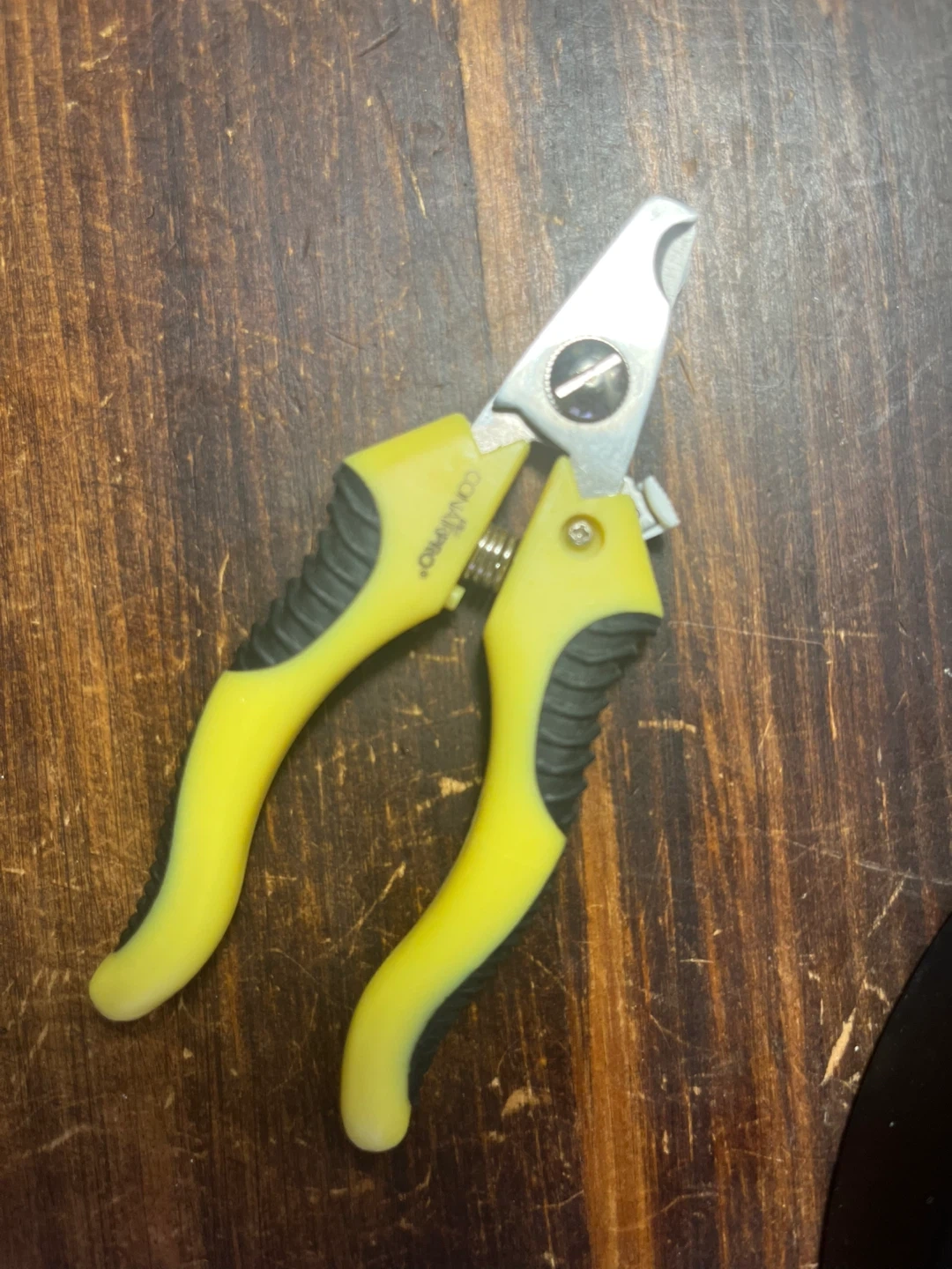 These are professional-grade pet nail clippers with yellow and black handles. They feature sharp stainless steel blades and a safety guard to prevent over-cutting. A built-in spring ensures smooth operation. These clippers are designed for home grooming use.