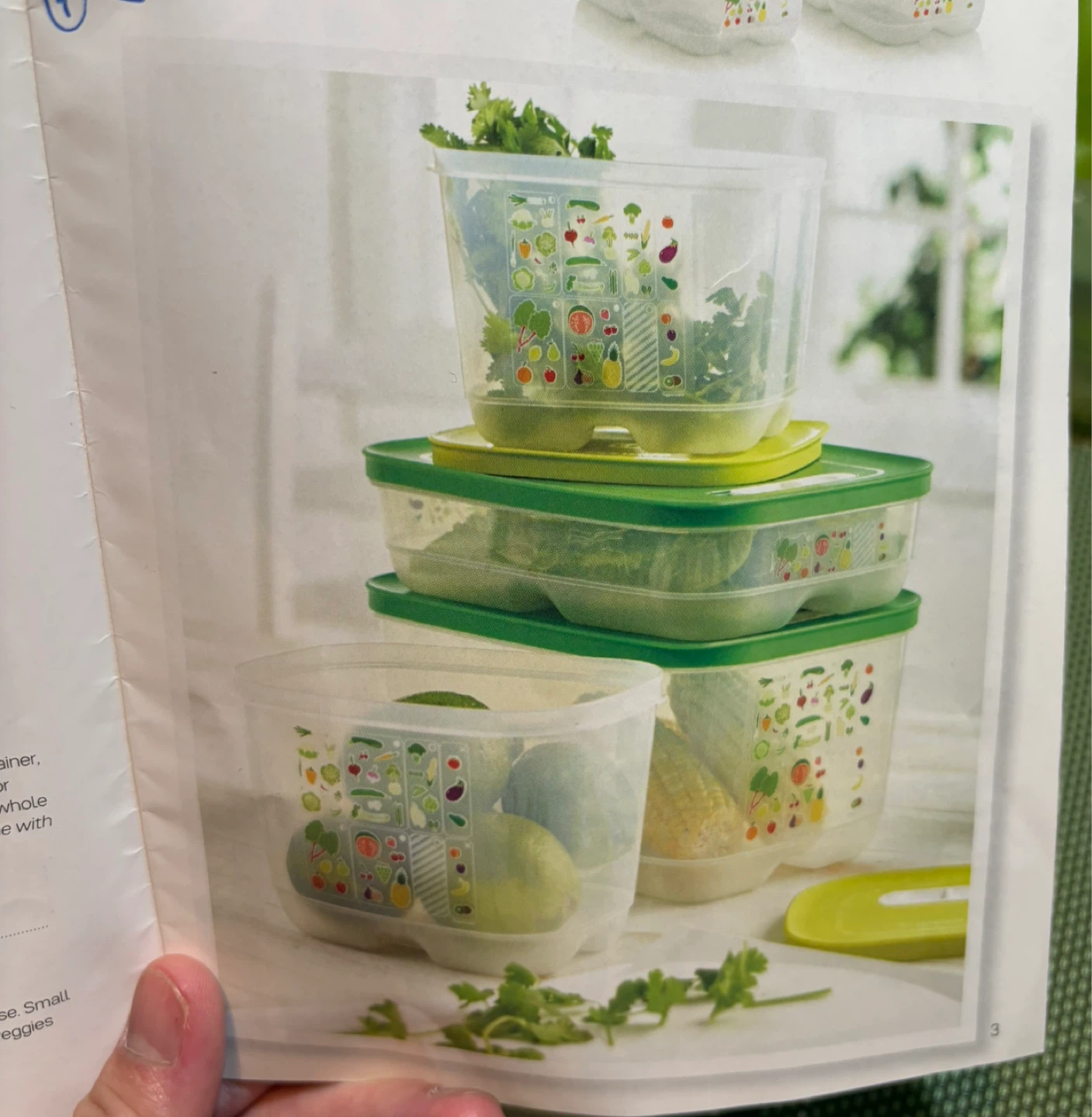 This is a set of Tupperware Fridge Smart containers. They're designed to keep produce fresh. They come with a venting system and a grid pattern on the bottom. Great for storing fruits and veggies!