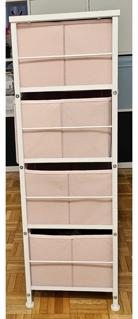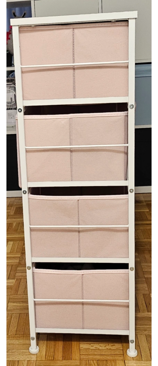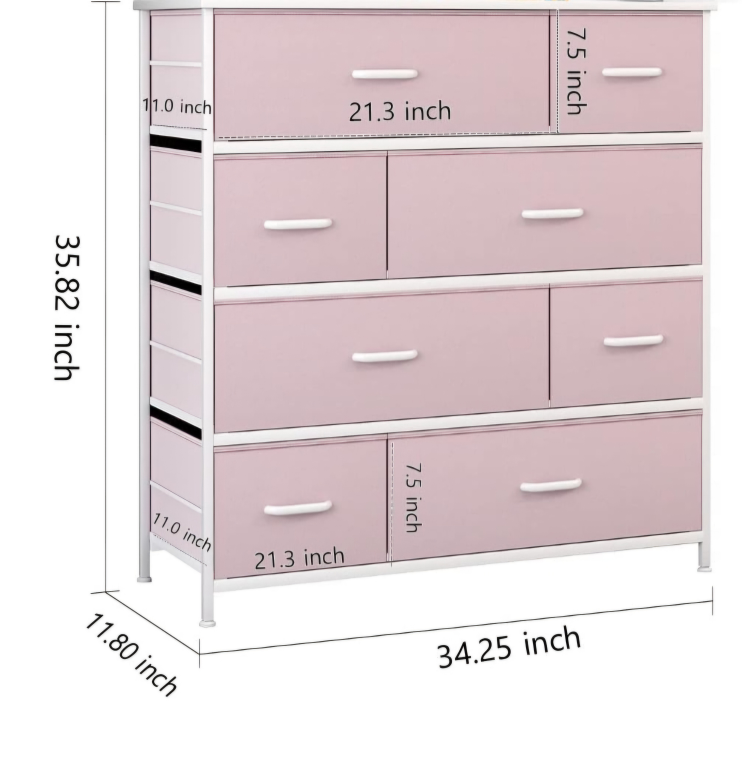 5• The dresser is made of metal frame and wooden tabletop. Contains 8 removable drawers with easy-to-pull wooden handles; Held up by 4 adjustable plastic legs. Colour of drawers: Pink Colour of frame: White • Product Dimensions: 34.25" (L) x 11.8" (W)x 35.82" (H). Drawer size: 21.3" (L)x 11.0" (W) x7.5"(H)/10.6" (L)x 11.0" (W) x 7.5"(H).