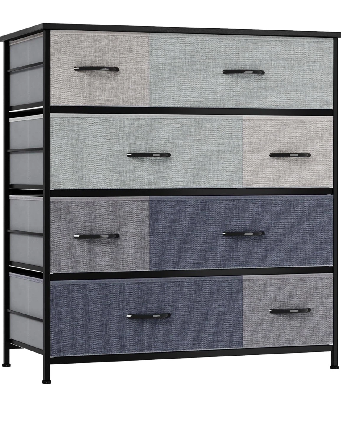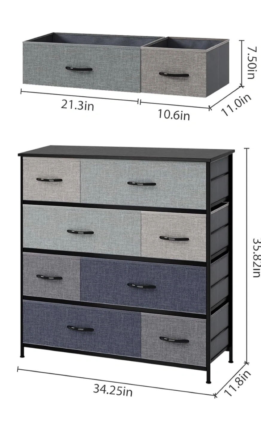 28Selling a fabric dresser with 8 drawers like-new condition! It's a great way to add extra storage to any room. The dresser features a sturdy black metal frame and several fabric drawers in varying shades of grey and blue. It measures 34.25 inches wide, 11.8 inches deep, and 35.82 inches tall. The top drawers are 21.3 inches wide and 10.6 inches wide.
