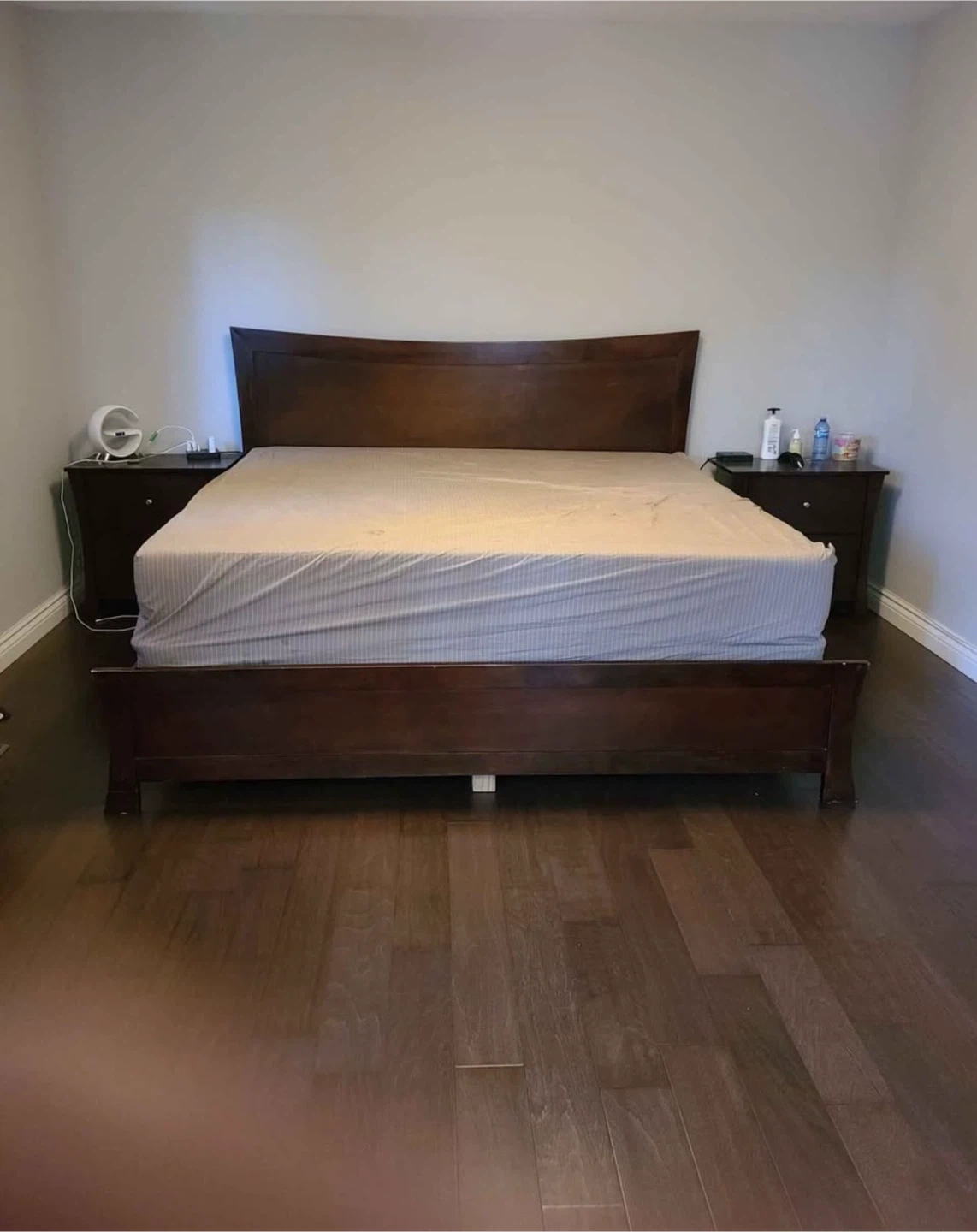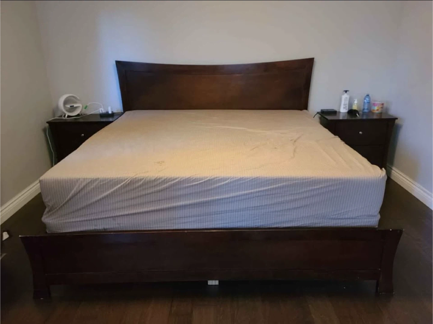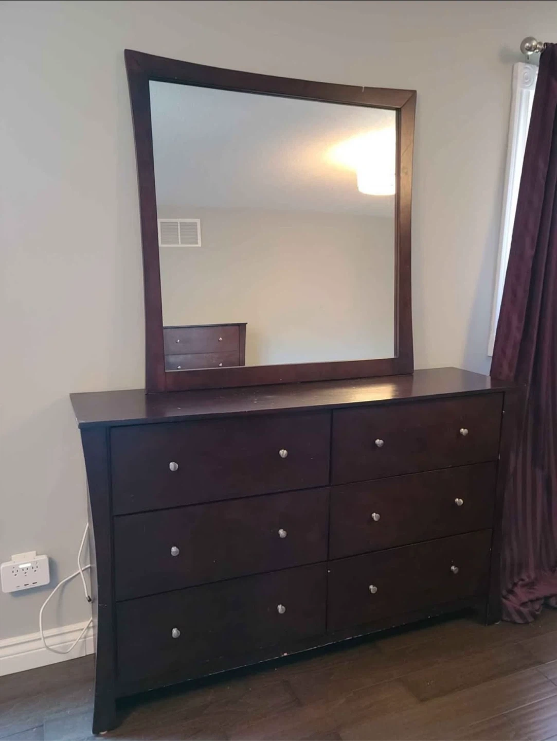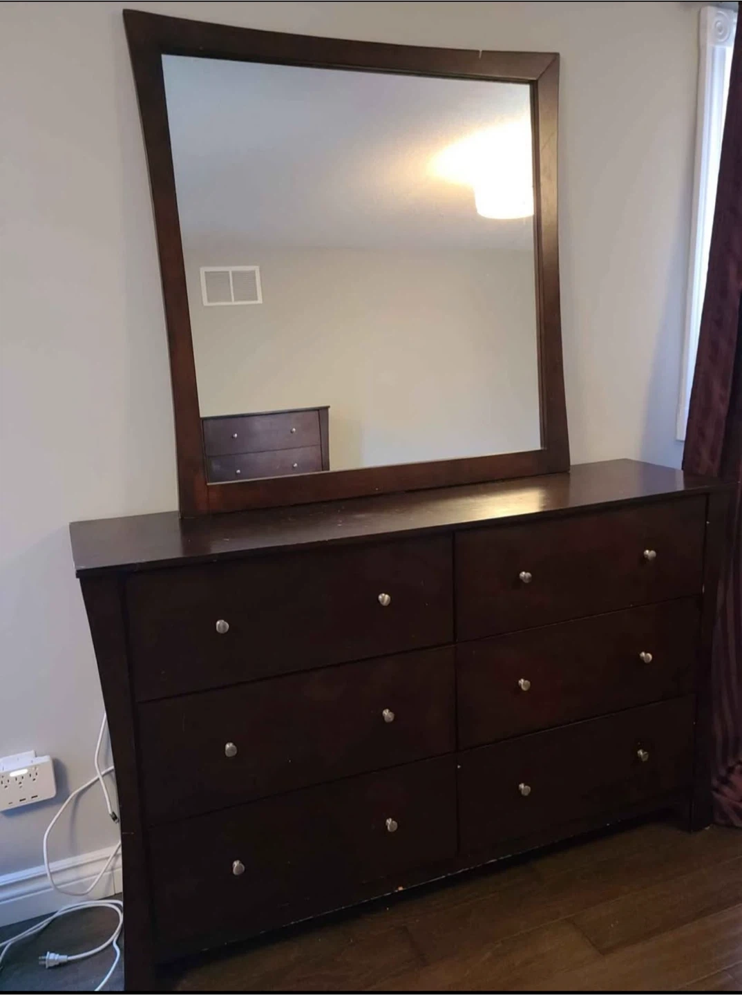 Selling a bedroom set in good condition. It includes a bed frame, two night stands, a dresser with a mirror, and a tall dresser