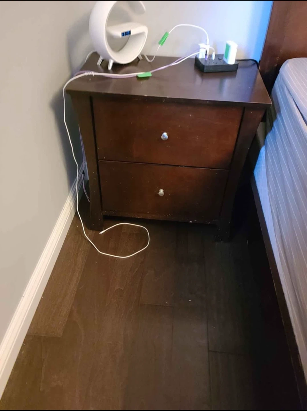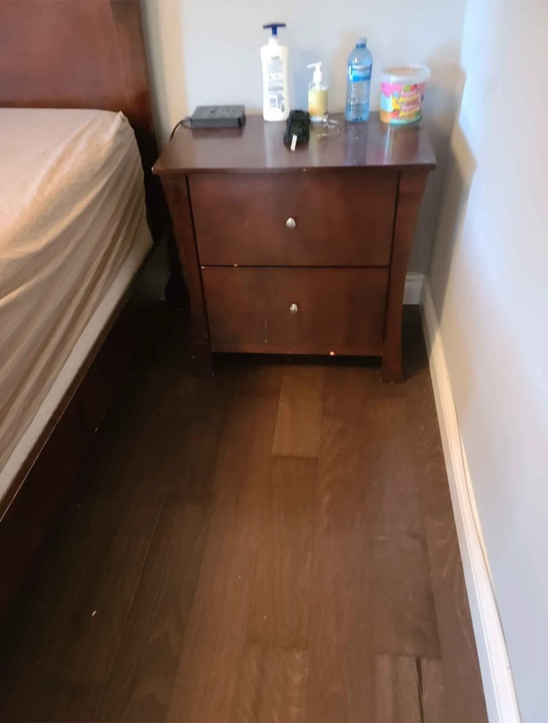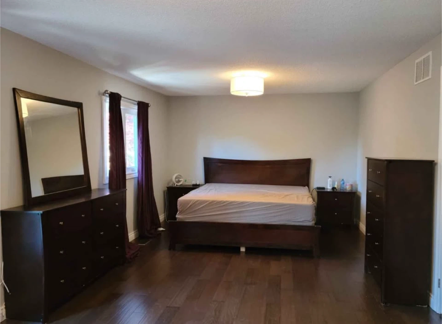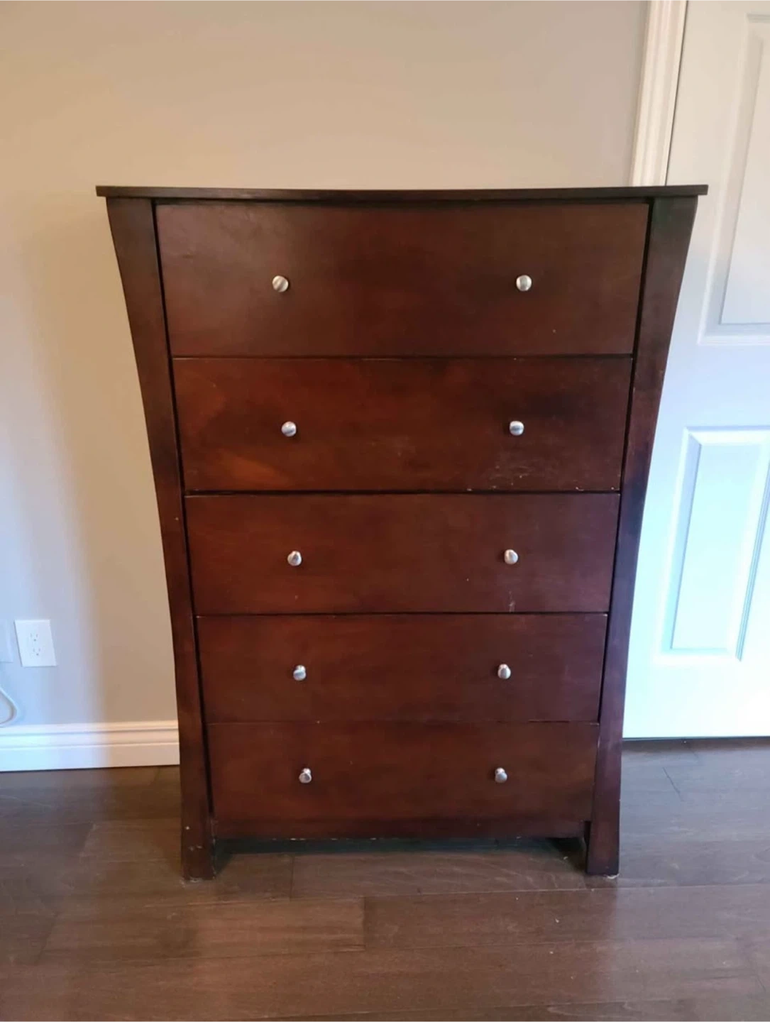 Selling a bedroom set in good condition. It includes a bed frame, two night stands, a dresser with a mirror, and a tall dresser