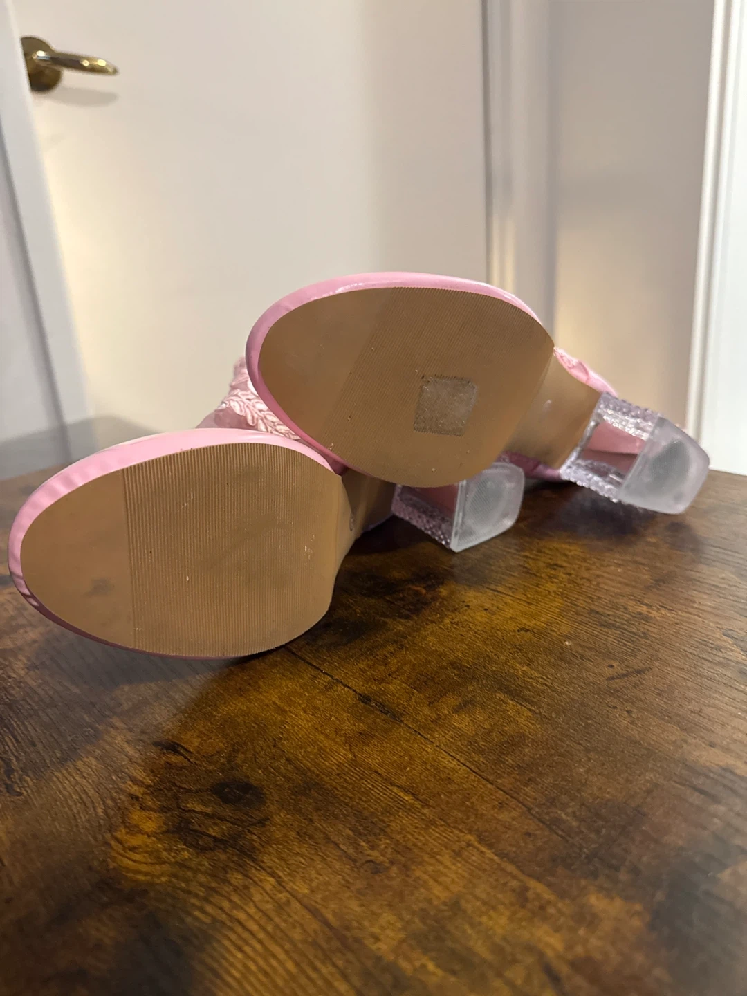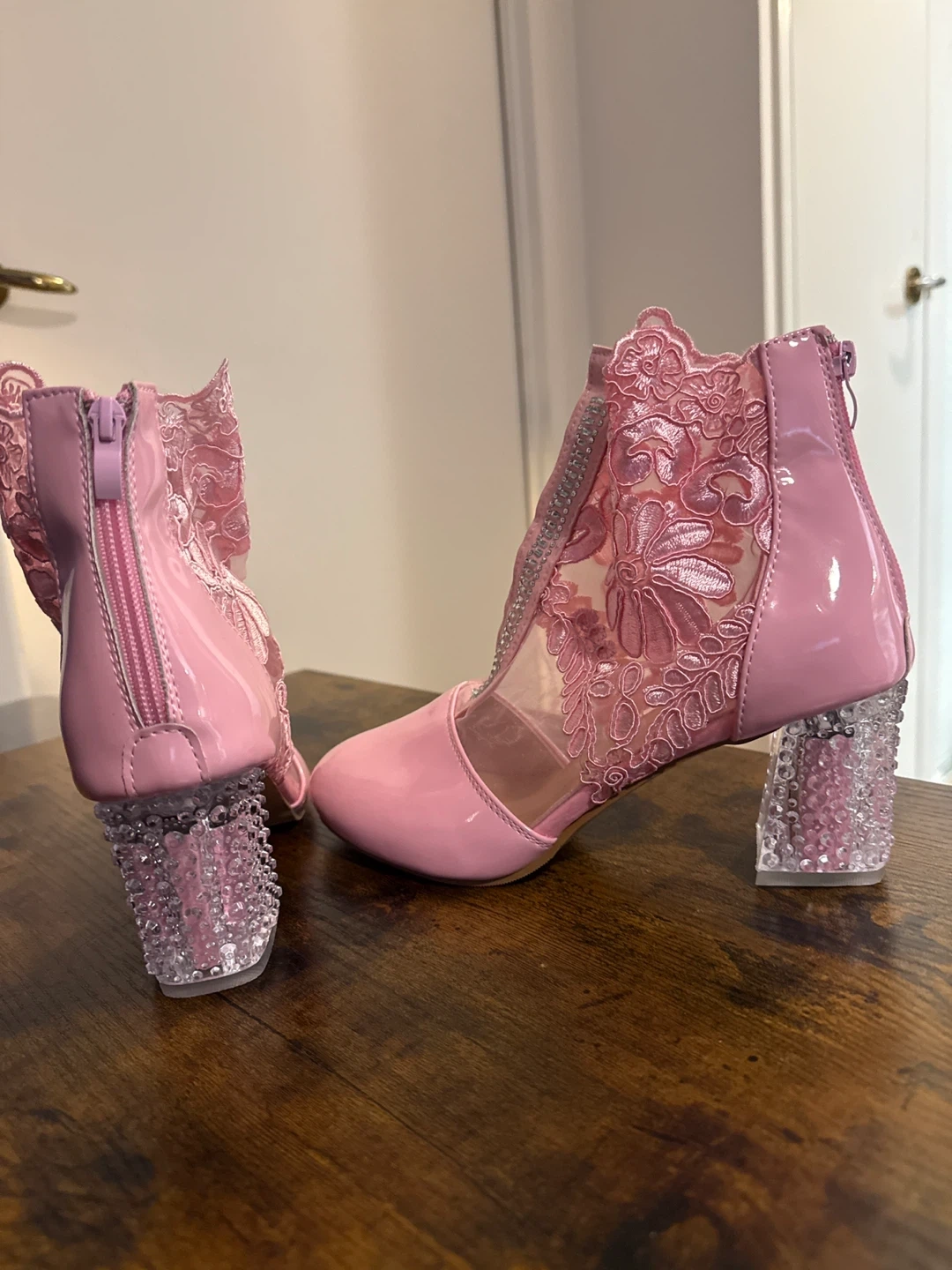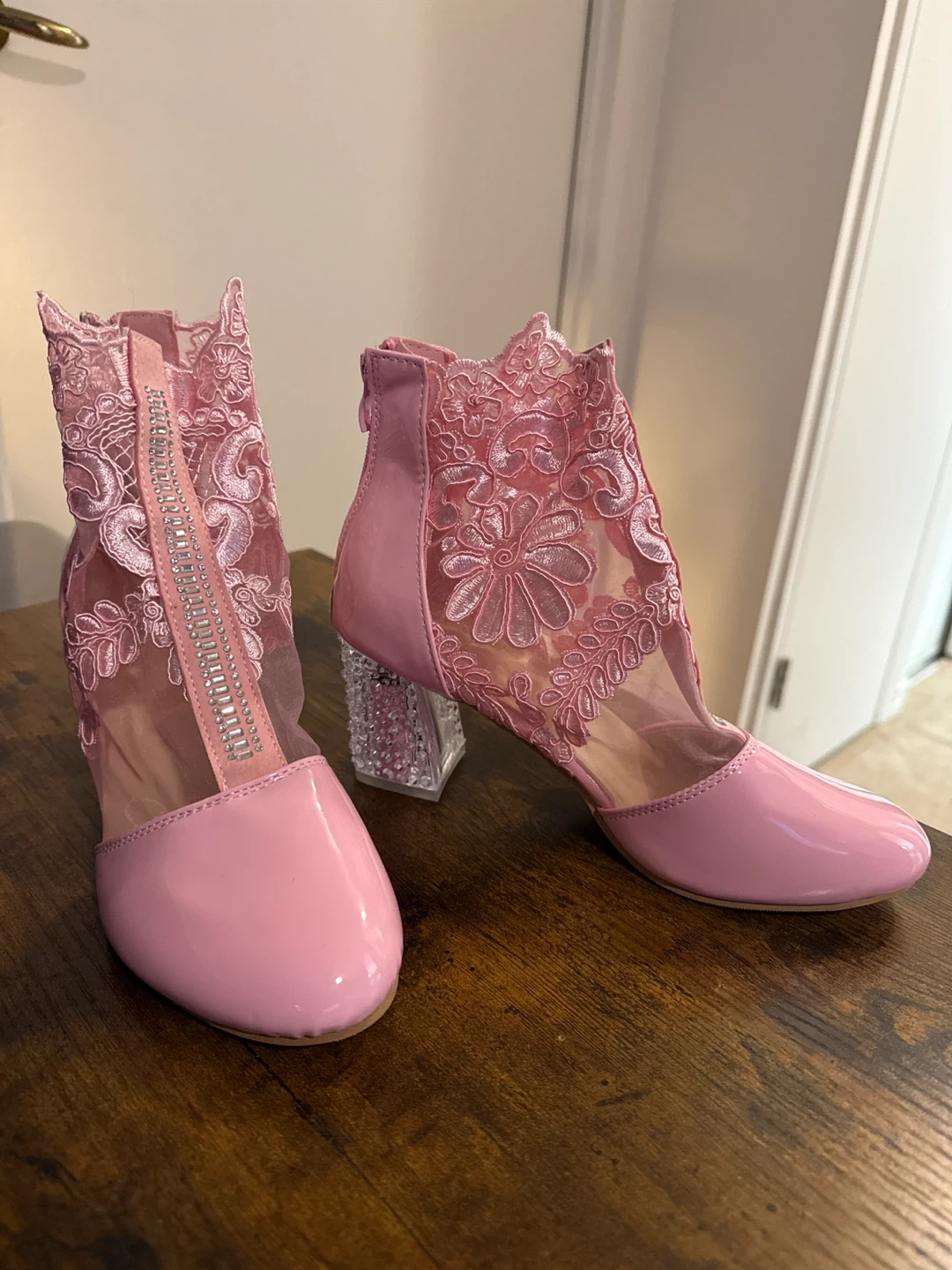 These are adorable pink lace heeled booties! They feature a clear block heel and a zipper closure. They are a size 8 and would be perfect for a night out!