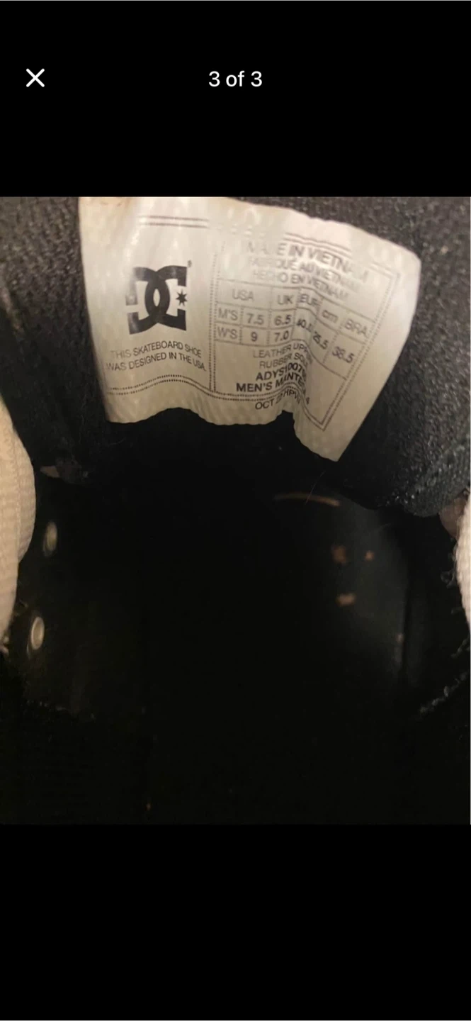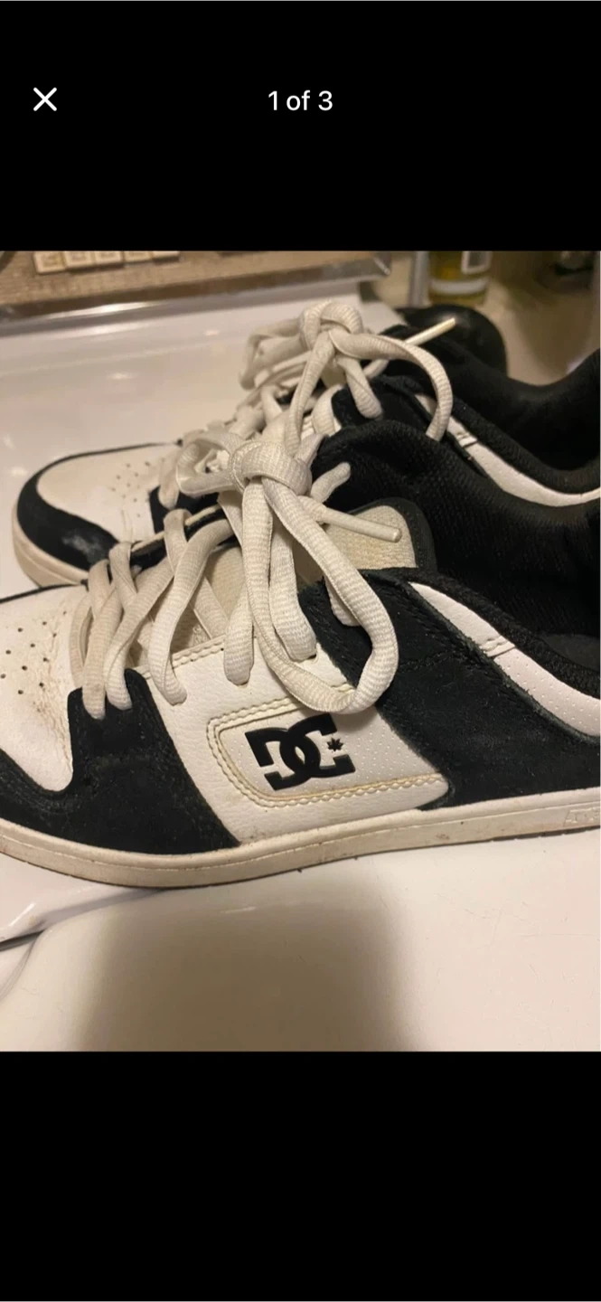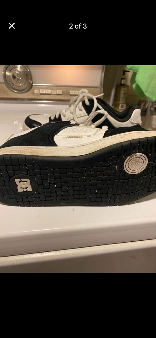 Selling a pair of DC skateboard shoes in mens size 7.5. ( women’s 9) They're black and white, perfect for skating or just casual wear. The shoes show some signs of wear, but still have lots of life left!
