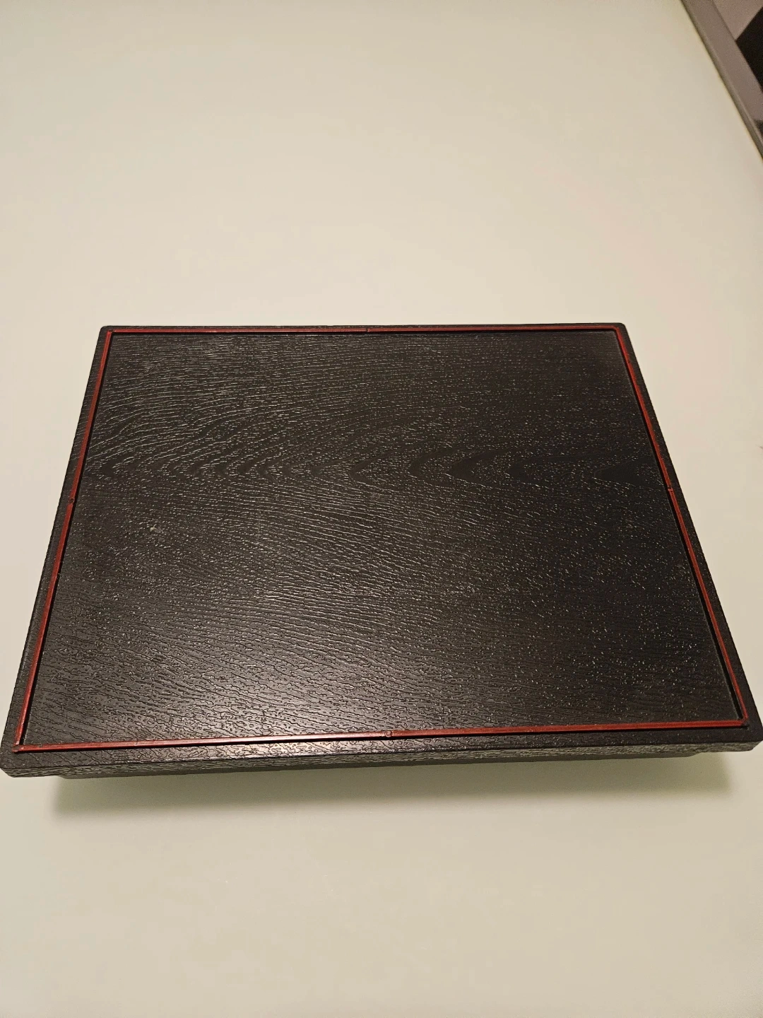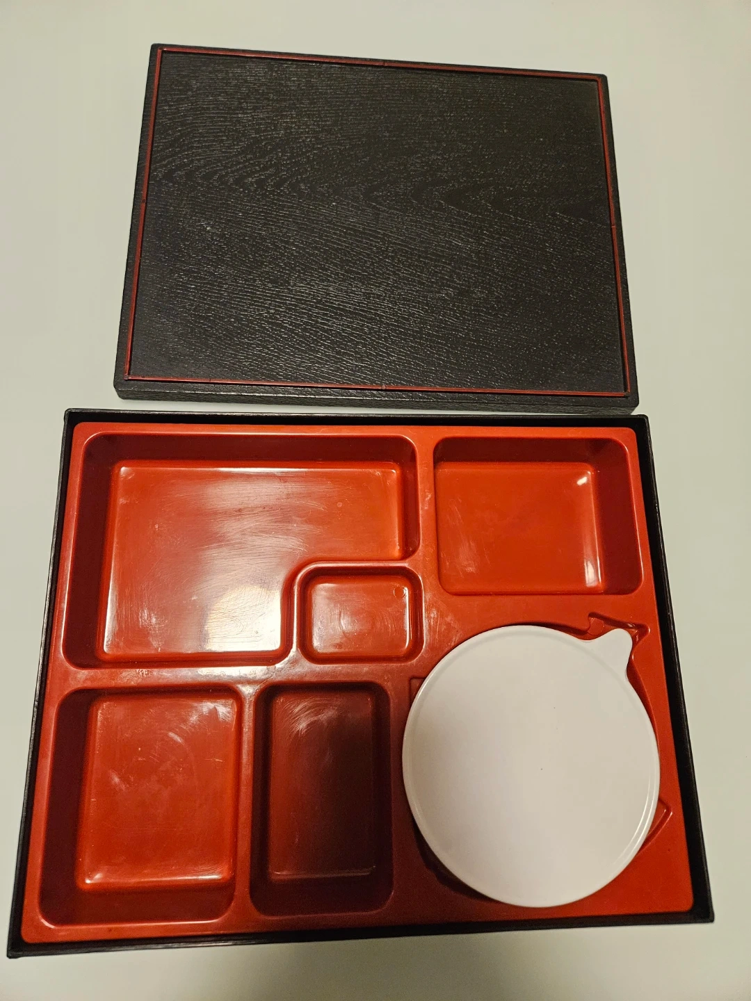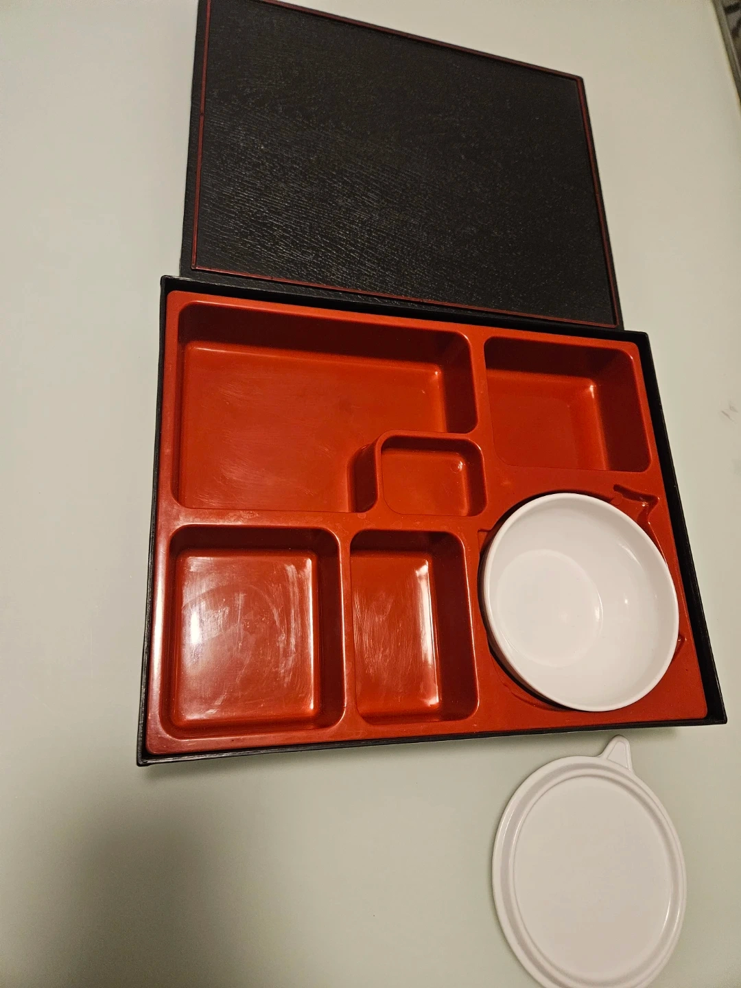 Selling a Japanese bento box. It features a black exterior with red trim, and a red interior with several compartments. A white bowl and lid are included