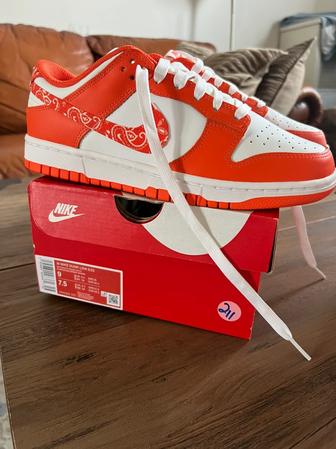 Selling a pair of Nike Dunk Low ESS sneakers in white and rush orange. These are a size 9 (US Women's). Comes with the original box!