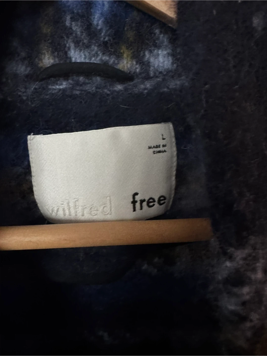 Cozy up in this Wilfred Free coat! It's a size large and features a plaid pattern in blues and yellows.