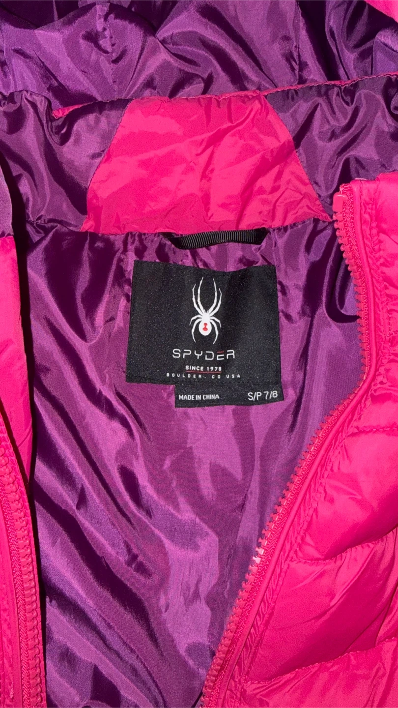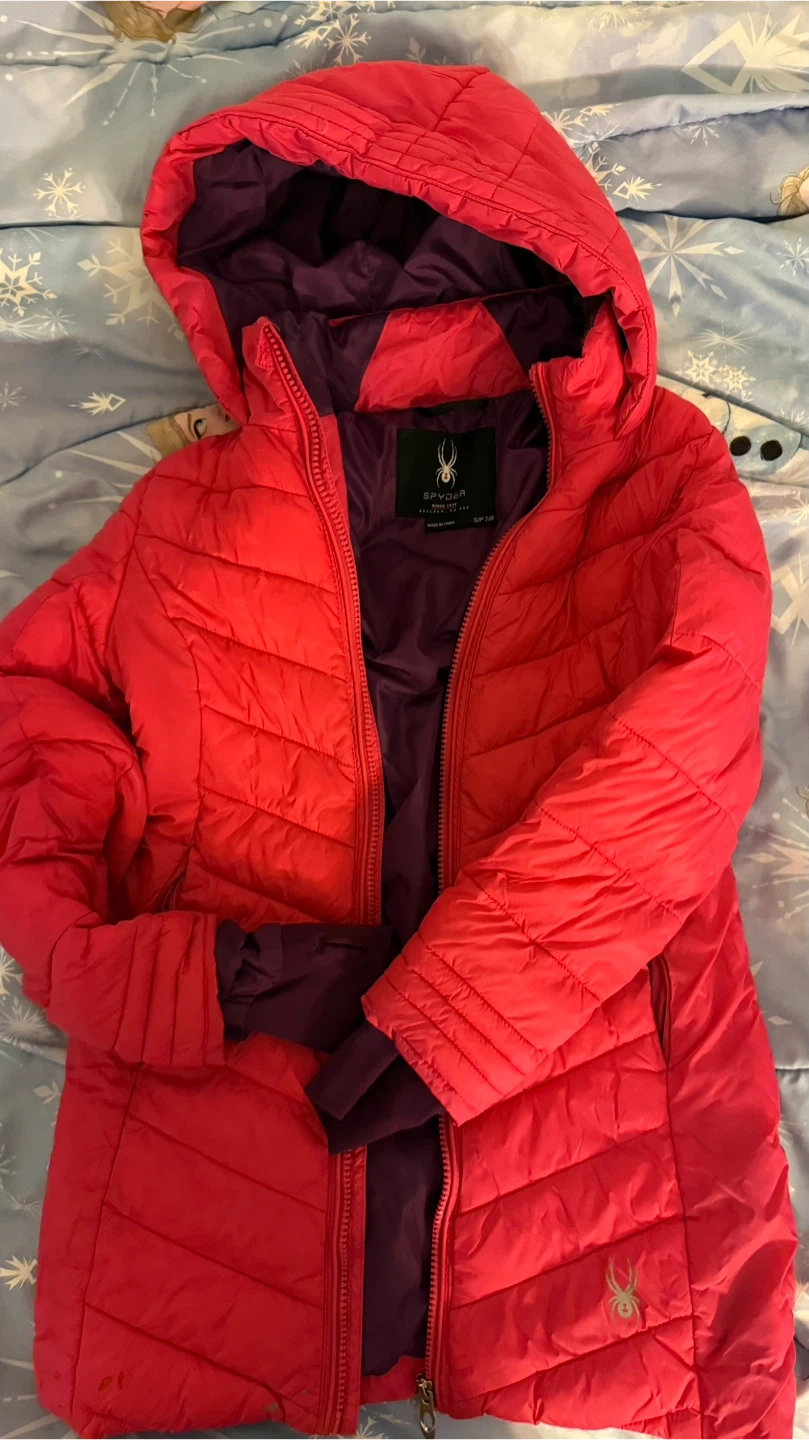 Selling a cute Spyder girls' puffer jacket in size S (7/8)! It's a vibrant red colour with a purple lining. Perfect for keeping warm and stylish during the colder months