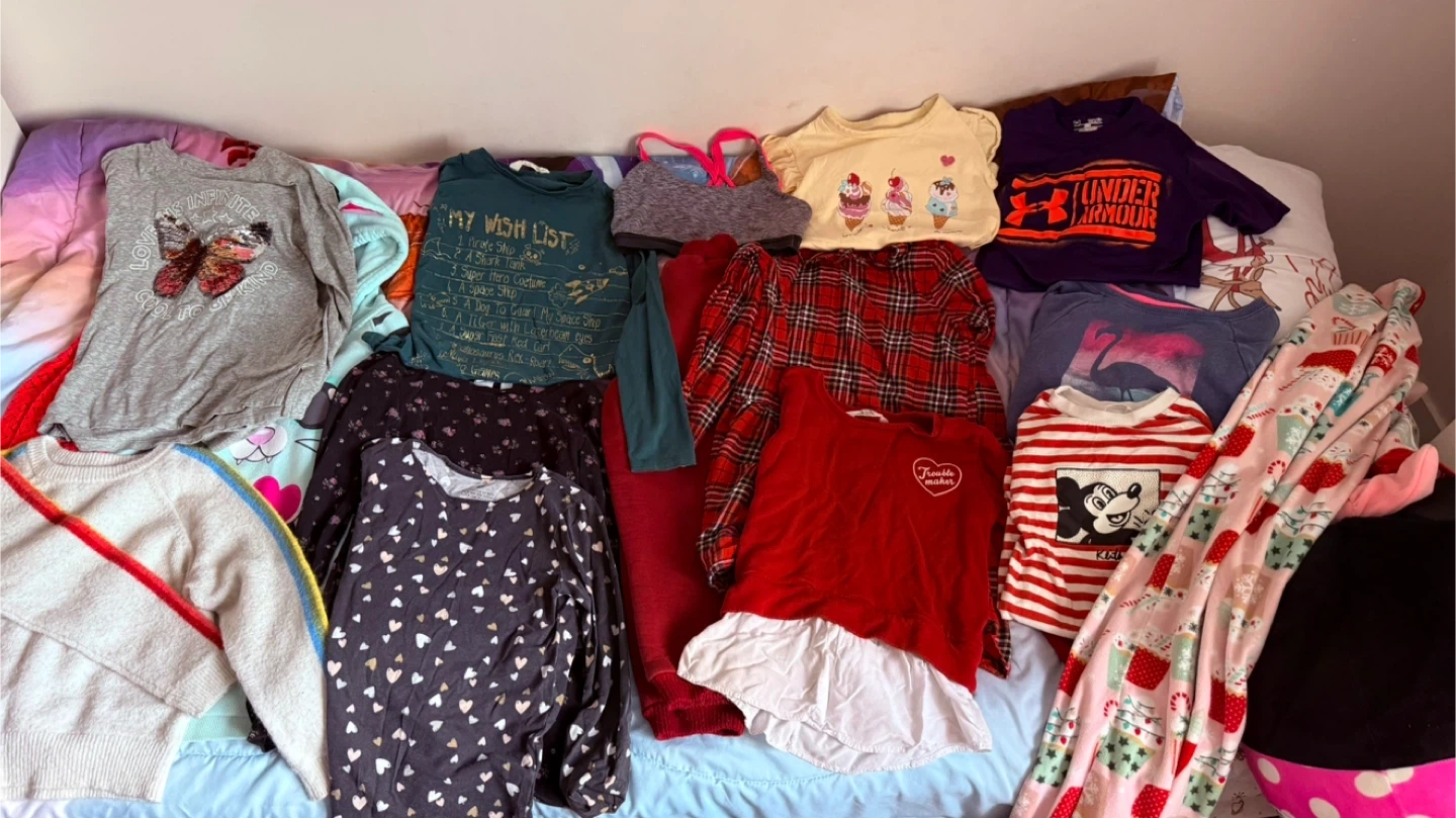 A mixed bundle of girls' clothing with various styles and brands. Includes items like Under Armour tops, graphic tees, and patterned shirts. Perfect for a growing wardrobe!Size 8/10 years old
